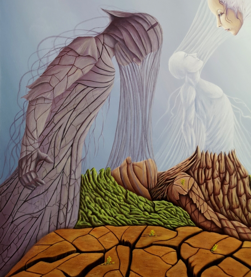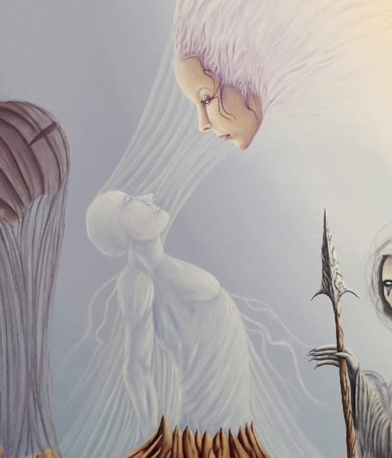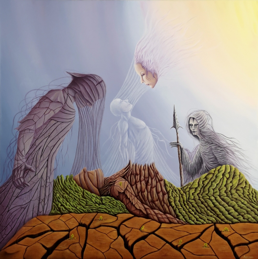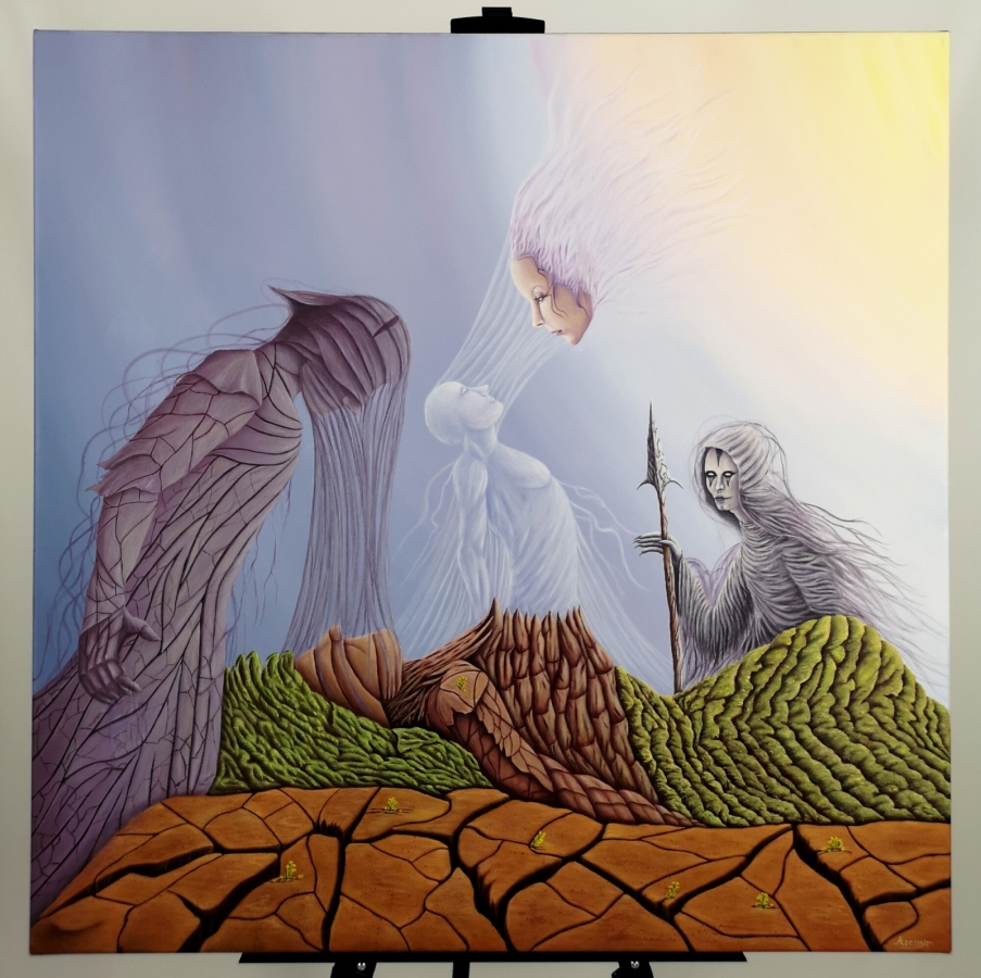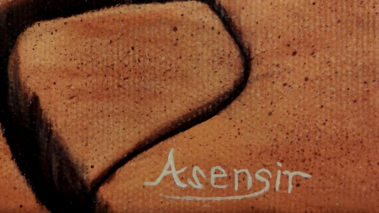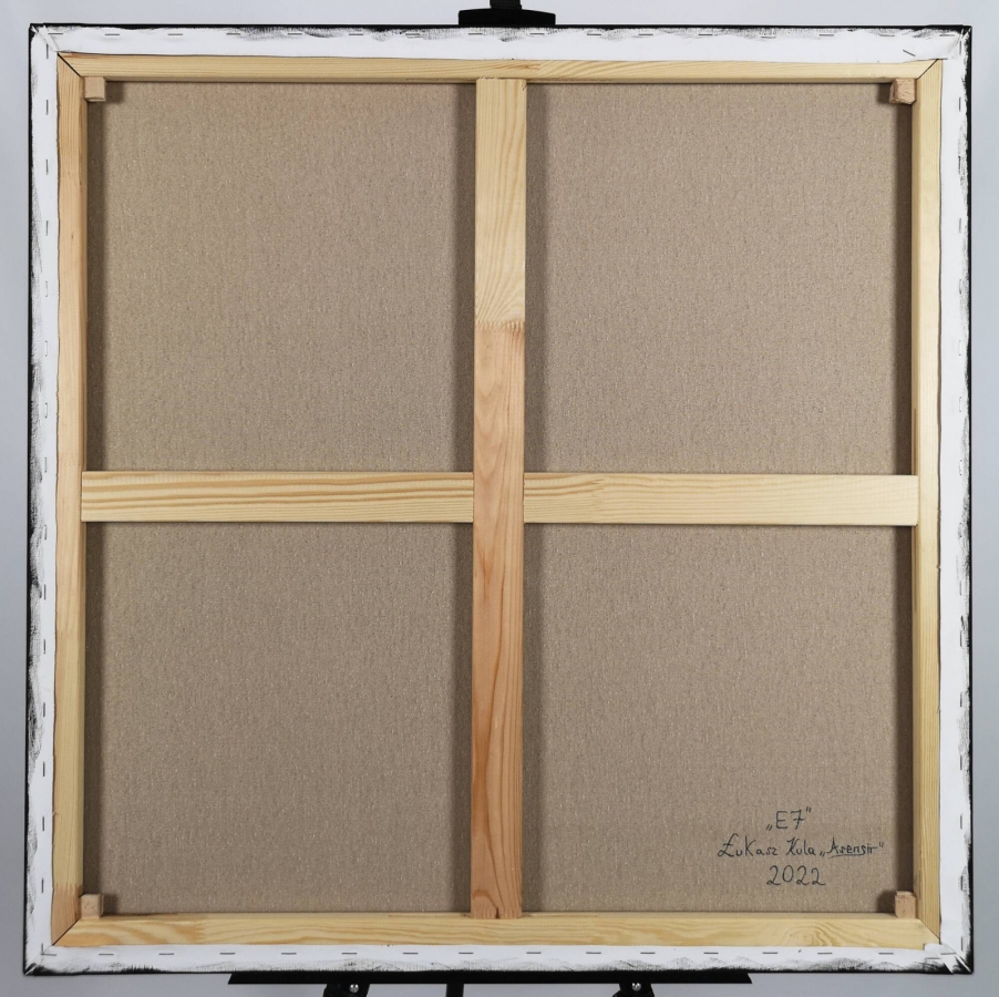 Obraz akrylowy na płótnie bawełnianym, malarstwo surrealistyczne. Praca sygnowana: z przodu - podpis artysty „Asensir”, z tyłu – tytuł / podpis, imię i nazwisko artysty / rok powstania. Praca nie zawiera ramy, boczne krawędzie płótna zamalowane estetycznie na czarno - obraz gotowy do powieszenia. Wymiary: 80x80x2cm. Obrazy artysty są spojrzeniem do świata snów. Cykl „E” to osobista seria prac, w której artysta konfrontuje się z własnymi emocjami, kruchością i doświadczeniami. Rozpadające się postaci, zatrzymane w jednej, melancholijnej chwili, pokazują balans pomiędzy mocą a słabością, brutalnością a spokojem. To szczera refleksja o tym, jak to jest być człowiekiem - o naszych pęknięciach, o miejscach, w których się gubimy, i o próbie zrozumienia siebie w chaosie uczuć. Pomimo mocnego ładunku emocjonalnego, prace utrzymane są w barwach, które działają jak subtelny filtr - pokazują, że nawet w najtrudniejszym doświadczeniu można dostrzec refleksję czy szansę na pogodzenie się z samym sobą. Prace artysty znajdują się w prywatnych kolekcjach w Polsce oraz m.in. w USA, Japonii, RPA, Niemczech, Hiszpanii, Francji, Izraelu.