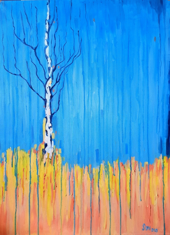 olej na płótnie bawełnianym. werniksowany. eksperymentalny pejzaż inspirowany abstrakcyjnymi obrazami partnera malarki. Nasyci kolorowami każde współczesne wnętrze.