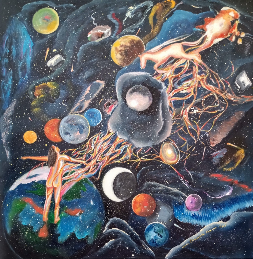 Czerpiemy energię z otoczenia i całego wszechświata. Kobieta symbolizuje biorcę kosmicznej energii w imieniu mieszkańców naszej planety. Koń jest upostaciowieniem płynącej do nas energii. Obraz bardzo wymowny, wielokolorowy z przewagą kosmicznego granatu, namalowany farbami akrylowymi na płótnie, ma zamalowane boki i zamontowaną zawieszkę.