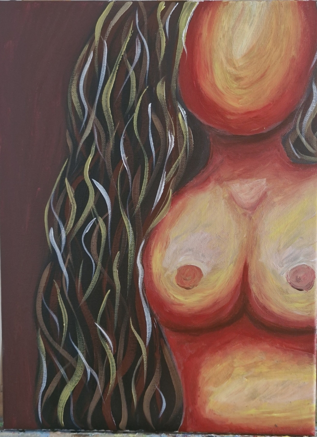 Kobiecy tors pozbawiony twarzy staje się nośnikiem światła. Ciepłe barwy budują wrażenie pulsującej energii. Z jednej strony kompozycji pojawia się organiczna struktura przypominająca włosy, korzenie lub płomień — symbol wzrostu i połączenia z naturą. Obraz opowiada o kobiecości jako sile pierwotnej, zmysłowej, ale także duchowej. Obraz na płótnie wykonany akrylem.