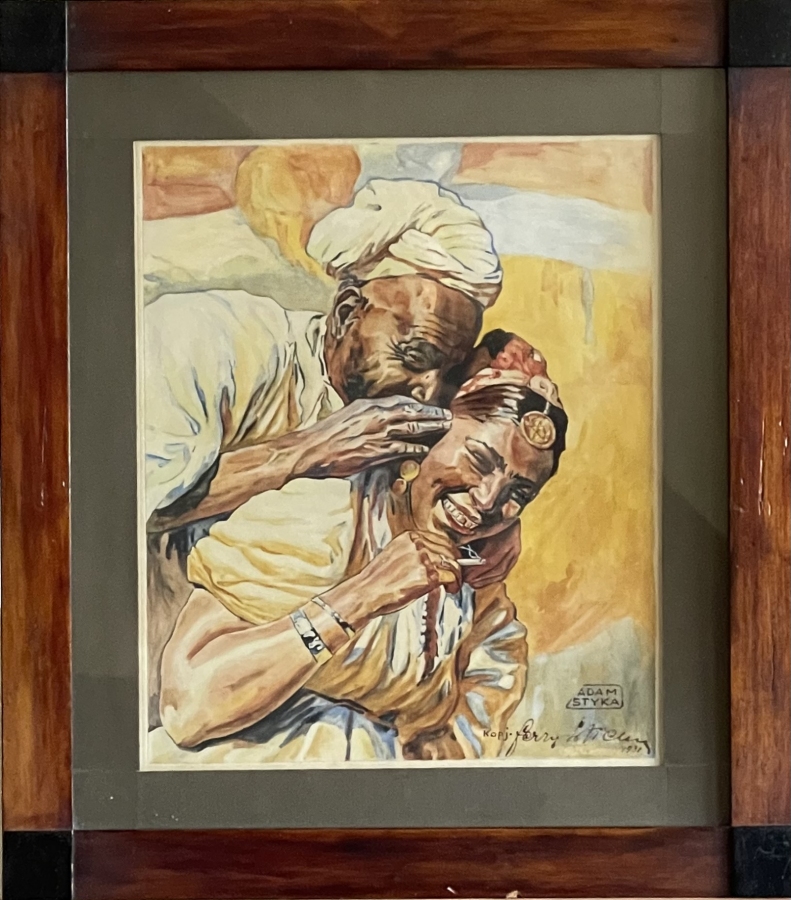 Adam Styka – „Flirt” (kopia), akwarela, 1931 r. Do sprzedania stara akwarela przedstawiająca scenę inspirowaną obrazem „Flirt” autorstwa Adama Styki. Praca została wykonana w 1931 roku przez Jerzego Etienne. Obraz ma wymiary ok. 39 × 34 cm (razem z passe-partout). Oprawiony jest w solidną, drewnianą ramę z epoki, zachowaną w bardzo dobrym stanie. Kolory żywe, papier nieuszkodzony, gotowy do ekspozycji. To interesująca kopia międzywojenna, która oddaje klimat malarstwa orientalnego początku XX wieku. Może być ciekawym dodatkiem do kolekcji lub eleganckim elementem wystroju wnętrza. Stan: bardzo dobry, bez przetarć ani ubytków. Technika: akwarela na papierze. Wymiary: 39 × 34 cm (bez ramy). Sygnatura: „Kopia. Jerzy Etienne 1931". Możliwa wysyłka lub odbiór osobisty.