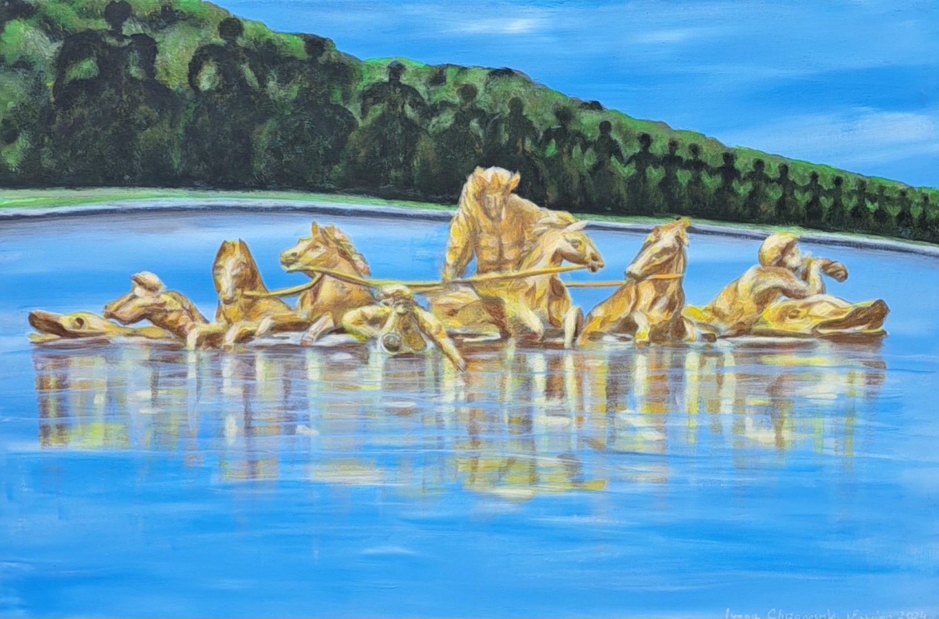 Obraz namalowany farbami akrylowymi Renesans i Amsterdam na płótnie w poziomie. Wspomnienie z podróży do Paryża. Postacie kobiet w balowych sukniach nie istnieją w rzeczywistości. Boki zamalowane, zamontowana zawieszka.