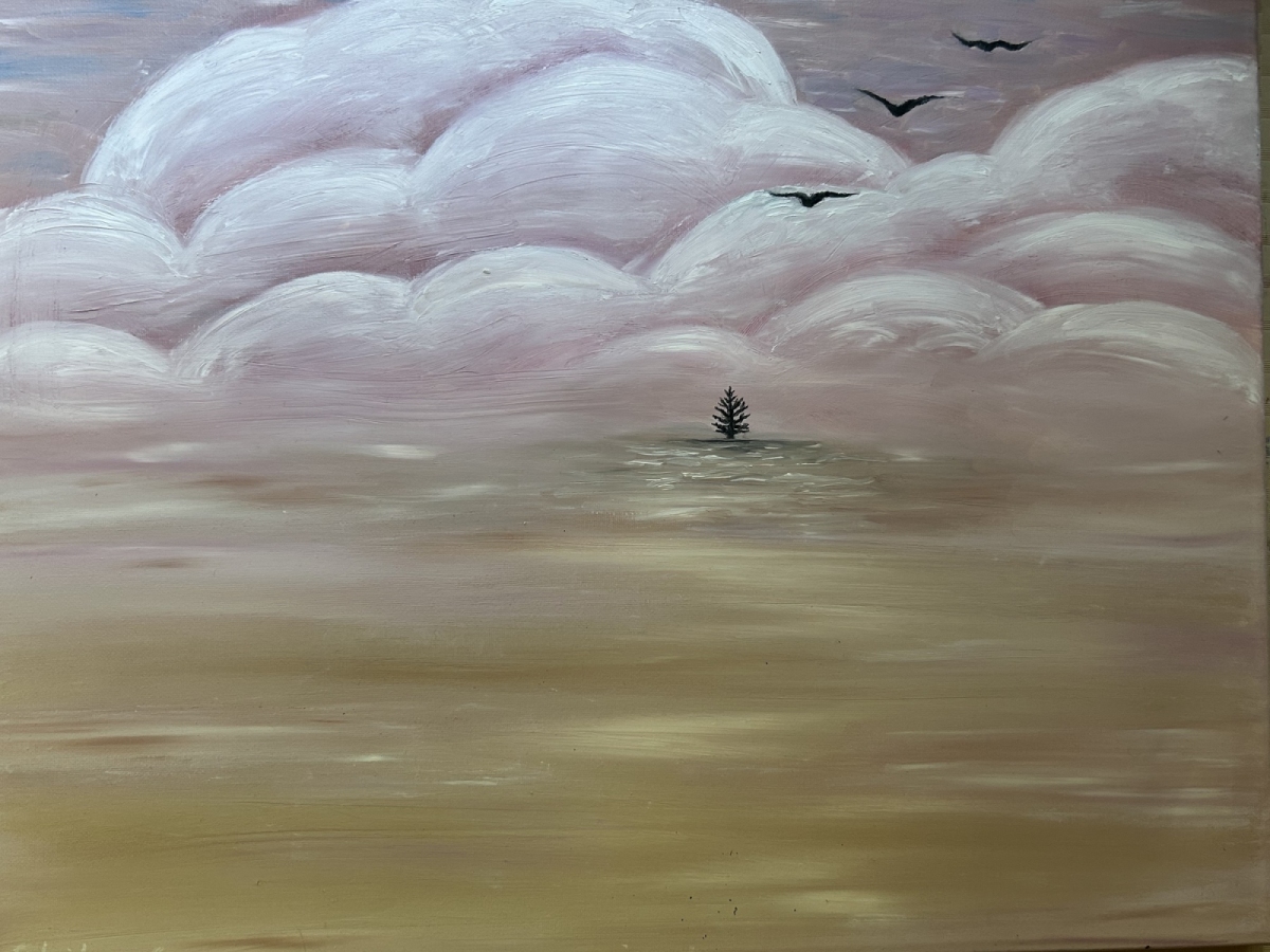 Obraz na płótnie bawełnianym, namalowany farbami olejnymi, używając nie konwencjonalnej metody malowania (dłoń). Wizją dzieła jest kraina z symbolicznymi ptakami i jednym drzewem. Symbolizuje to samotność w pięknym otoczeniu, nie zależnie gdzie się znajdujesz jakie piękno jest wokół ciebie dalej można czuć się samotnym bądź nie pasującym do otoczenia. Można też go interpretować w sposób własny np. Powrót ptaków do miejsca początku, emocje towarzyszące przy tworzeniu były spójne, odczuwany był spokój i harmonia. Dany obraz może wywołać różne emocje, reakcje i odczucia, chwilę do przemyśleń i przeróżnych interpretacji