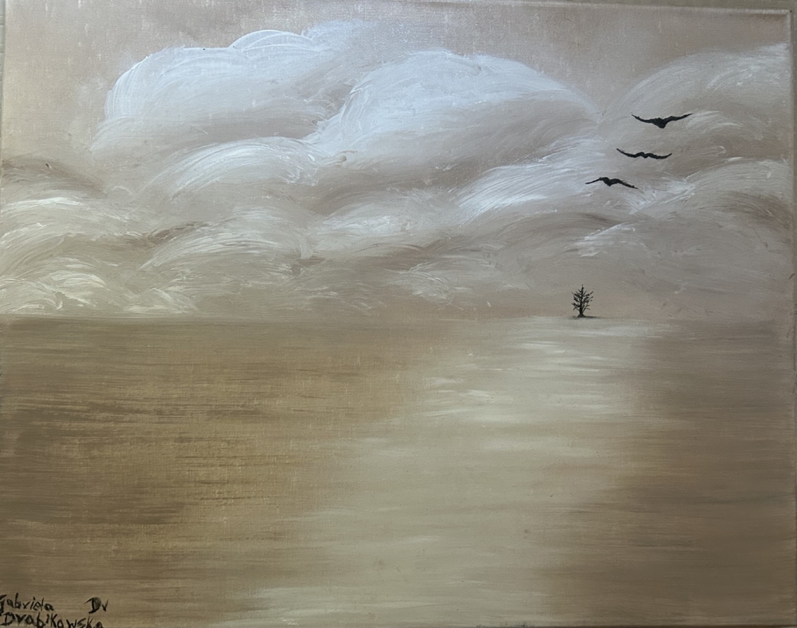 Obraz olejny, namalowany na płótnie z kolekcji Piękno w Prześwitach. Przedstawia nostalgiczny moment powrotu ptaków do swojego drzewka i drogę ze światła do samotności bądź drogę do spokoju. Symbolizuje jedność, światło, samotność, spokój. Kolorystyka beż, brąz, biel była dobrana aby nie tylko obraz wzbudził różne emocje w tym spokój oraz chwile do rozmyśleń ale i również pasował do wnętrz.