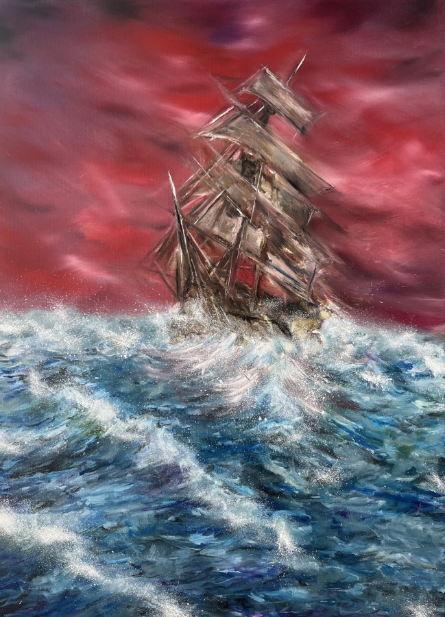 Wyjątkowy, ręcznie malowany obraz farbami olejnymi w stylu ekspresjonizmu, wykonany na płótnie o wymiarach 50x70 cm. To dynamiczna i pełna emocji kompozycja przedstawiająca statek walczący z potężnym żywiołem wzburzonego morza. Intensywne, nasycone czerwienie nieba kontrastują z chłodnymi błękitami fal, tworząc dramatyczną scenę pełną napięcia, ruchu i energii. Obraz symbolizuje siłę, walkę, przetrwanie oraz determinację w obliczu przeciwności losu. Gruba faktura farby, uzyskana dzięki pracy pędzlem i szpachlą malarską nadaje dziełu wyjątkową głębię i wyrazistość – obraz „żyje” w zależności od światła. Technika: farby olejne na płótnie Styl: ekspresjonizm Wymiary: 50 x 70 cm Wykonanie: pędzel + szpachla malarska Stan: nowy, gotowy do powieszenia Idealny jako mocny, przyciągający uwagę akcent do nowoczesnych wnętrz, salonu, biura lub pracowni.