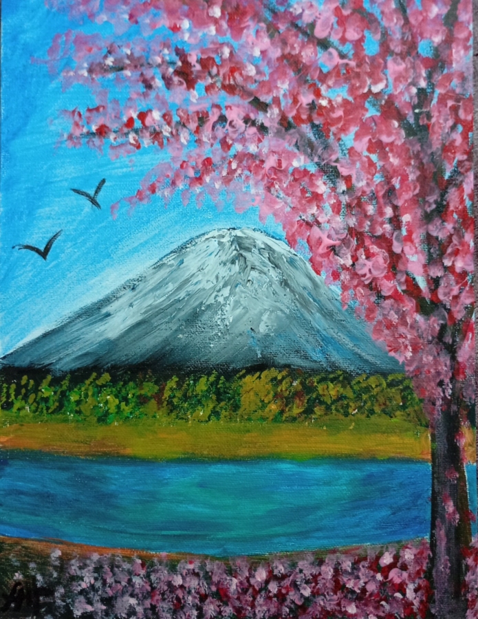 Obraz namalowany farbami akrylowymi i szpatułka na płótnie malarskim podobrazie Obraz przedstawia góry, spokój relax