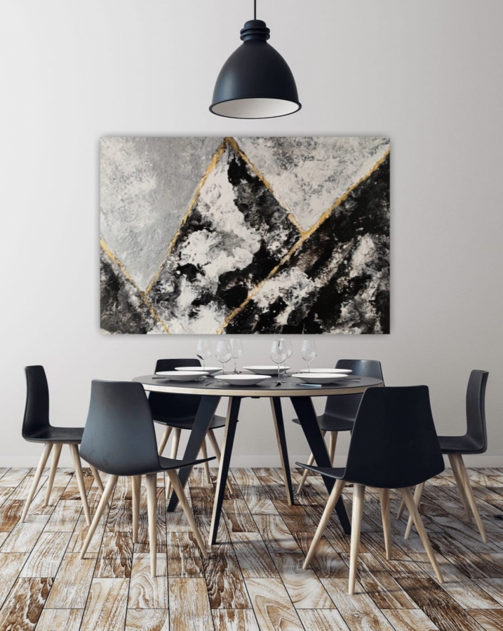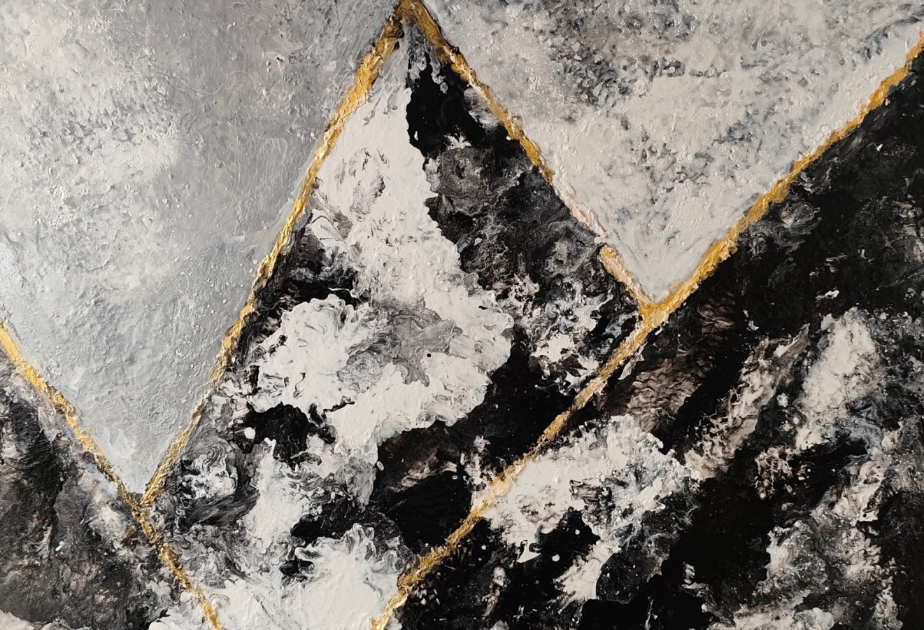 Zapraszam do zakupienia obrazu abstrakcyjnego mojego autorstwa przedstawiającego góry. Obraz jest akrylowy, kolory szarości , czerni i złota. Wymiary 75x115 cm. Jest unikatowy, doda wnętrzu elegancji. Można zawiesić go bez ramy ponieważ ma zamalowane boki. Obraz na płótnie, mocno odznaczająca się tekstura.