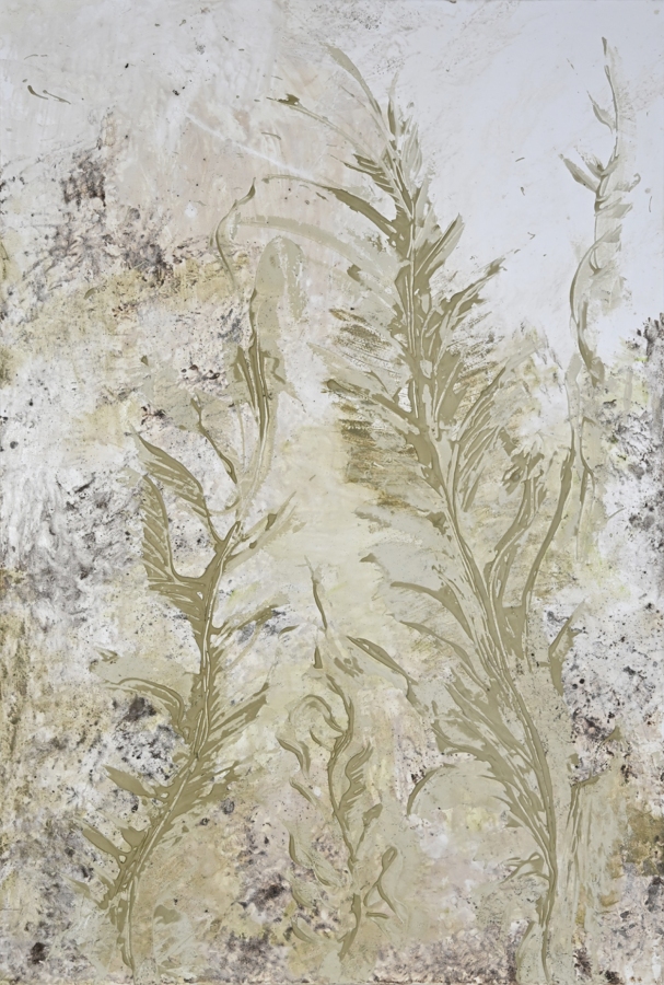 Abstrakcyjne, organiczne kompozycje roślinne wyłaniają się z wielowarstwowej, ziemistej faktury, tworząc subtelny dialog między naturą a materią. Delikatne linie przypominające liście i łodygi zostały wprowadzone w powierzchnię obrazu gestem spontanicznym, lecz precyzyjnym, dzięki czemu całość pulsuje naturalnym rytmem. Paleta jasnych beżów, szarości i odcieni oliwkowych buduje atmosferę spokoju, ciszy i zanurzenia w krajobrazie, który bardziej się odczuwa, niż widzi. Praca balansuje między abstrakcją a motywem botanicznym, sugerując ulotność roślinnych śladów pozostawionych na powierzchni ziemi. Teksturalne warstwy nadają obrazowi głębię i charakter, podkreślając organiczny, niemal archeologiczny wymiar kompozycji. To dzieło o kontemplacyjnym nastroju, stworzone z myślą o wnętrzach, które szukają harmonii, naturalności i subtelnej elegancji.