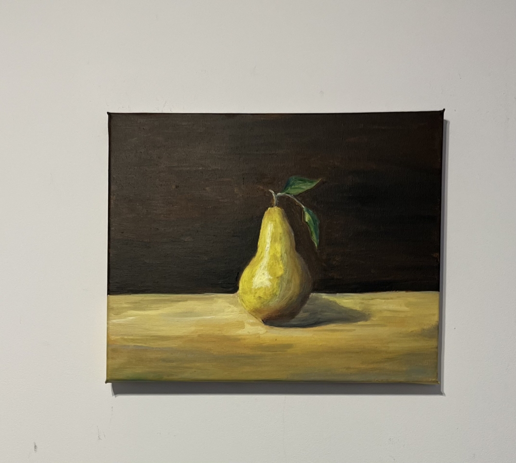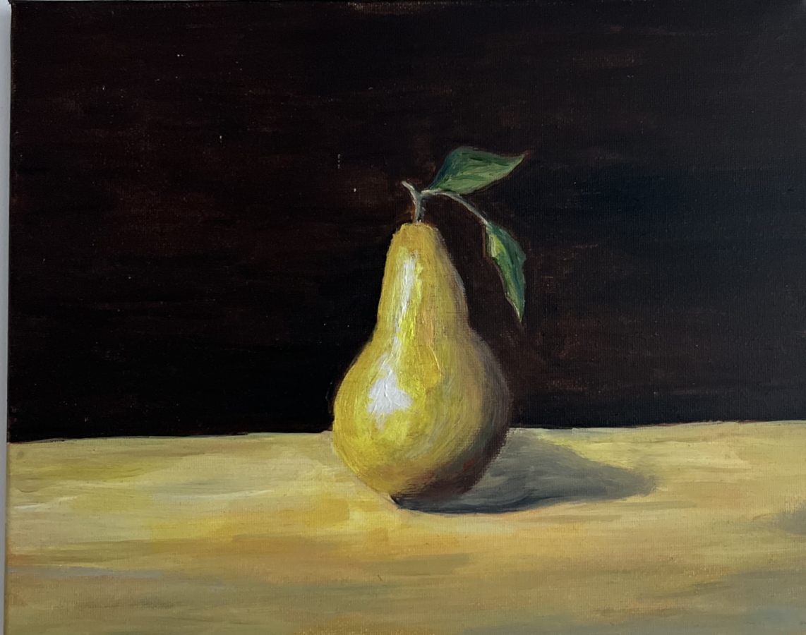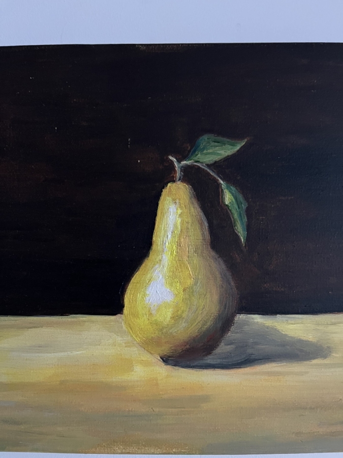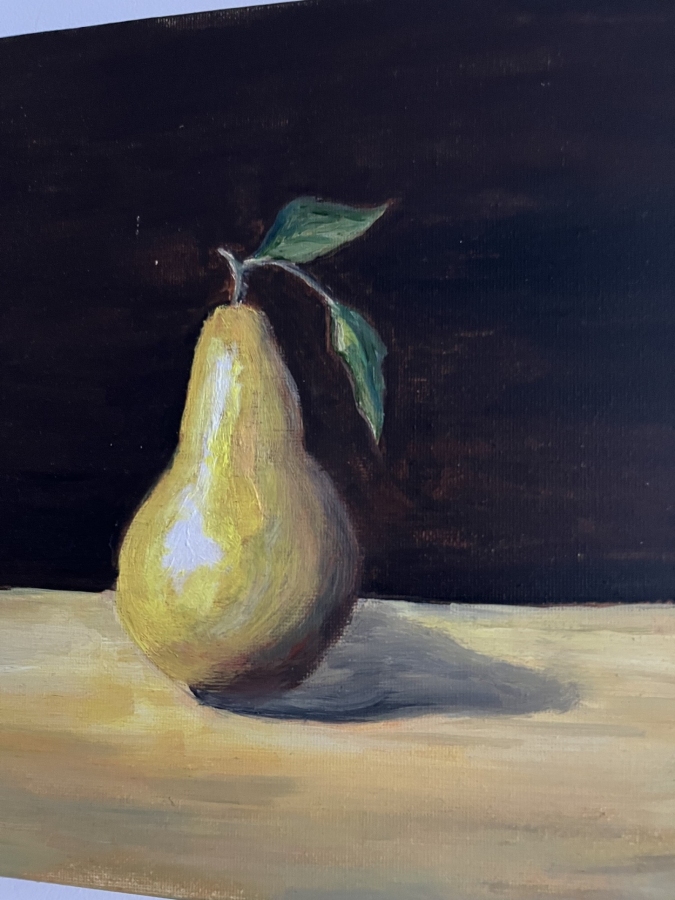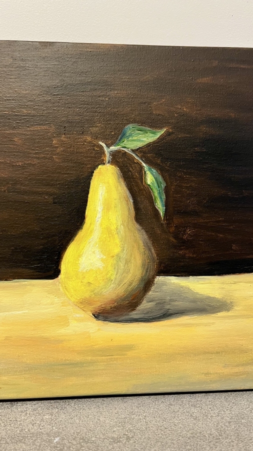 „Gruszka w świetle” – martwa natura, olej na płótnie 30 × 24 cm, płótno na drewnianym blejtramie Ta martwa natura oddycha ciszą. Gruszka stoi w świetle jak bohater skromnej, ale bardzo prawdziwej opowieści. Delikatne przejścia barw i miękki cień przy jej podstawie tworzą wrażenie, jakby w tej jednej chwili świat zatrzymał się dla niej — żeby mogła po prostu być. Tło, ciemne i spokojne, pozwala owocowi wybrzmieć pełnią swojej formy i koloru. To obraz, który nie narzuca się, ale zostaje w pamięci jak krótkie, jasne wspomnienie.