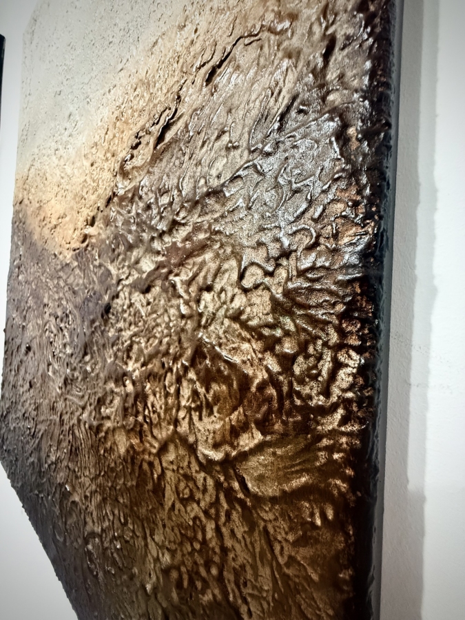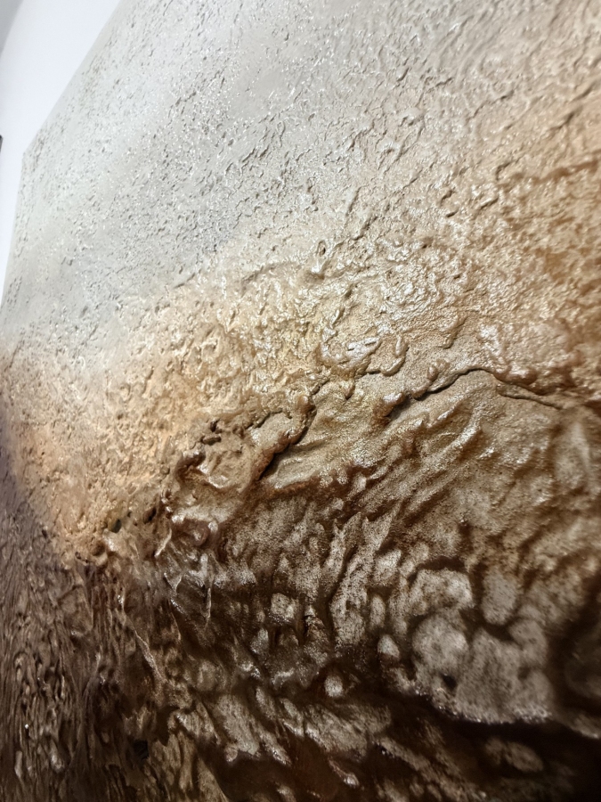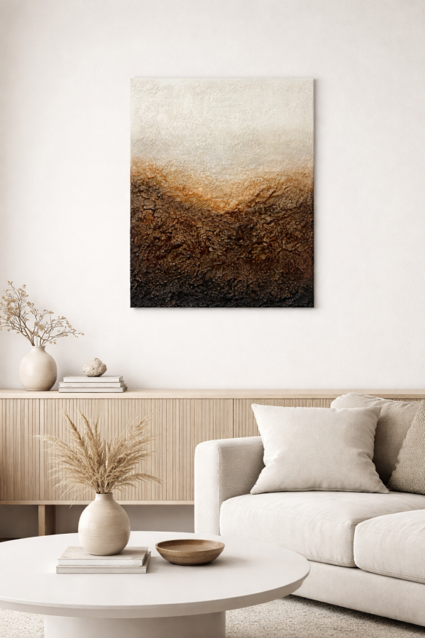 Strukturalna abstrakcja inspirowana naturą i horyzontem. Warstwowa faktura oraz stonowana paleta bieli, piasku i głębokich brązów budują poczucie spokoju, zakorzenienia i równowagi. Obraz zmienia się wraz ze światłem, ujawniając subtelne niuanse materii i głębi. Akryl na płótnie. Powierzchnia obrazu jest zabezpieczona werniksem. Boki zamalowane, nie wymaga ramy. Idealny do salonu, biura.