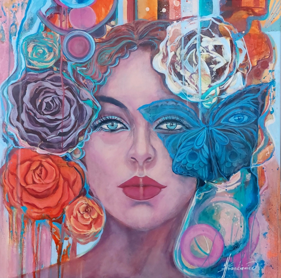 Obraz akrylowy malowany na płótnie 70x70 cm. Boki obrazu są zamalowane. Sygnatury autorskie umieszczone z przodu i z tyłu obrazu. Obraz jest artystycznym przekazem ukazującym kobiecą umiejętność do odczytywania sygnałów niewerbalnych i emocji. ,,,,,,,,,,,,,,,,,, Art By Jolanta Frankiewicz ,,,,,,,,,,,,,,,,,,,,,,,