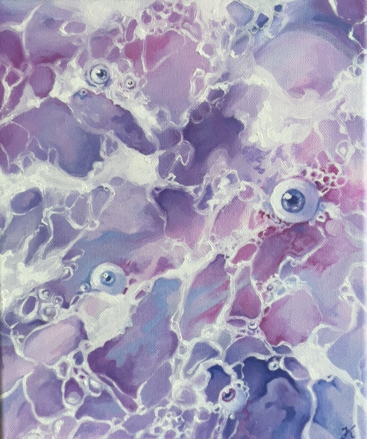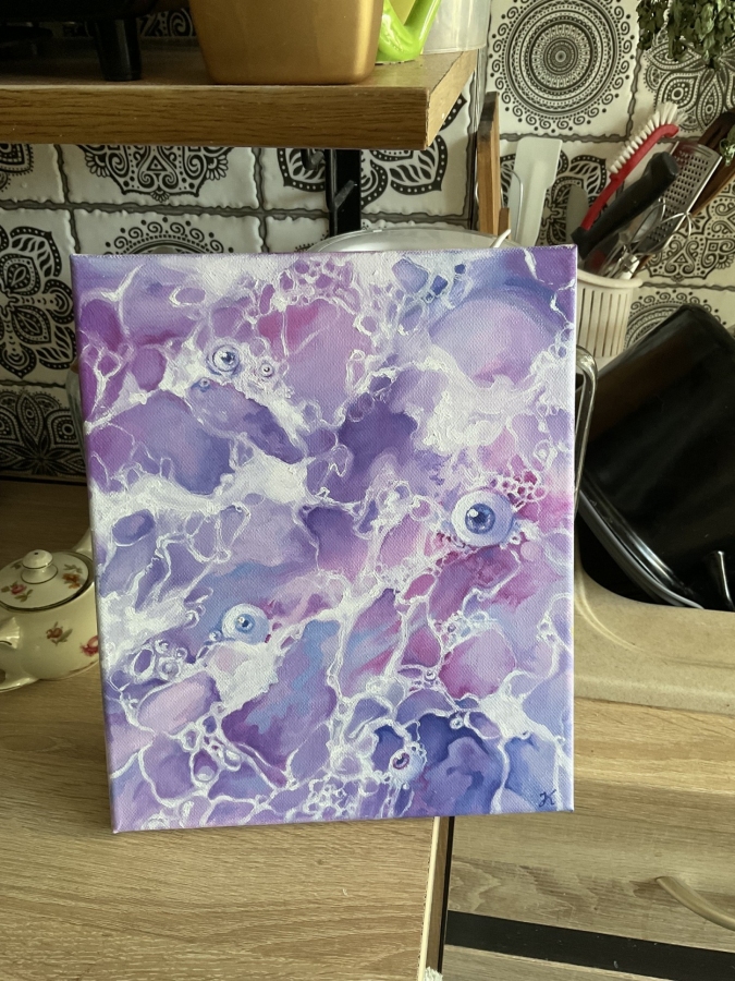Jeden z 3 obrazów w tej seri, przedstawiający impresje Shake’a jagodowego z umiejscowionymi oczami w przestrzeniach małych pęcherzyków powietrza. Kolorystyka zachowana jest w ciepłych przyjemnych różach i fioletach, kontrastując z oczami umiejscowionymi w kompozycji.