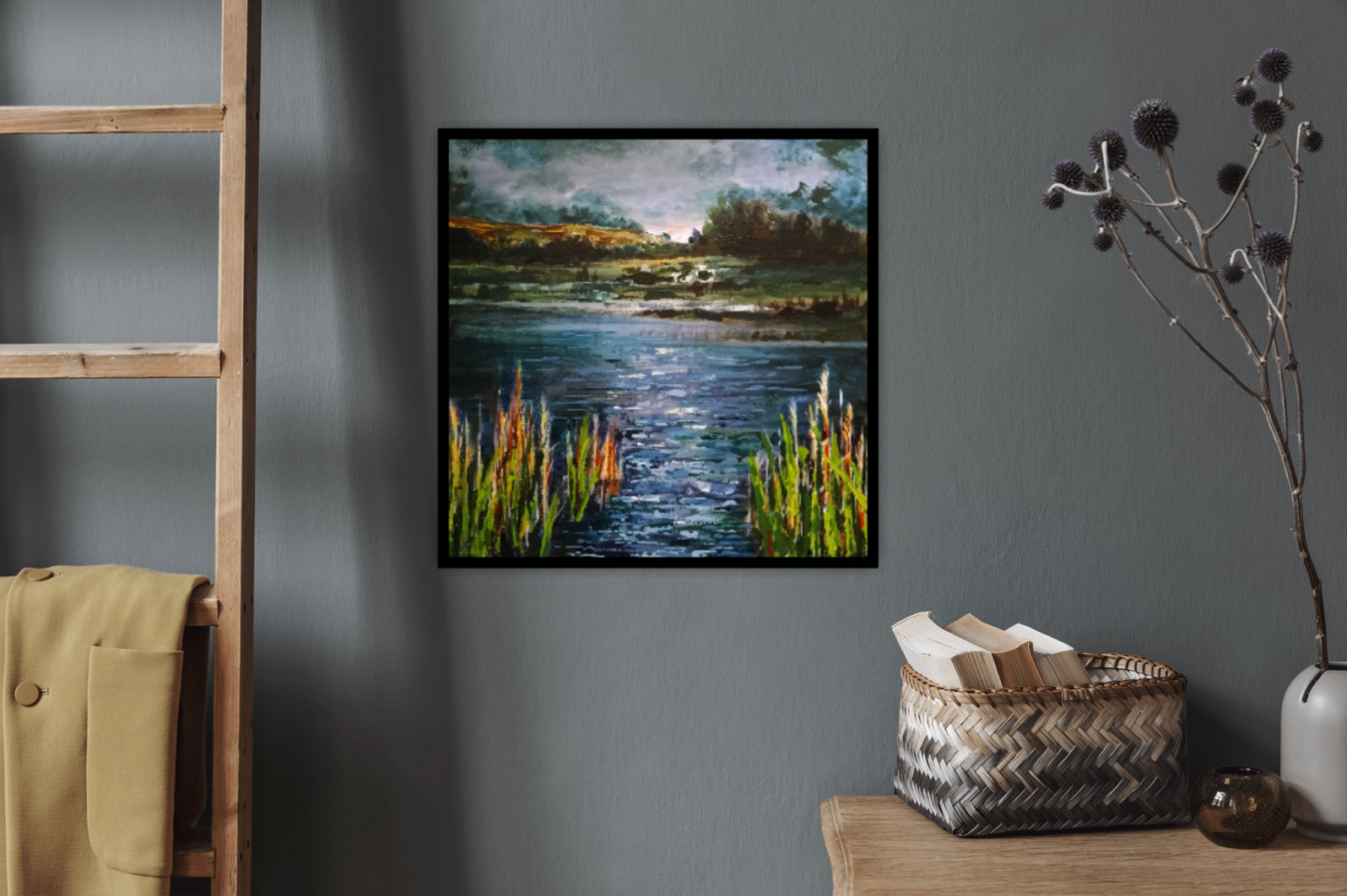 Obraz stanowi malarską interpretację ulotnej chwili spokoju nad brzegiem jeziora w momencie, gdy gasnące światło dnia spotyka się z nadchodzącym mrokiem chmur. Inspiracją dla autora była surowość i melancholia pejzażu jeziornego, gdzie granica między niebem a wodą staje się płynna. Praca nie jest jedynie odtworzeniem natury, ale próbą uchwycenia emocji towarzyszących wyciszeniu – od głębokiego spokoju tafli wody po dynamiczne, niemal niepokojące niebo. To unikalne rękodzieło artystyczne zostało wykonane w technice akrylowej na płótnie, z wyraźnym wykorzystaniem szpachli malarskiej. Dzięki temu dzieło zyskuje bogatą, niemal rzeźbiarską strukturę (impasto), która sprawia, że obraz żyje w zależności od kąta padania światła. Paleta barw opiera się na głębokich granatach i chłodnych zieleniach, które zostały przełamane ciepłymi akcentami ochry oraz świetlistymi refleksami bieli, imitującymi migotanie wody. Widoczne pociągnięcia pędzla i tekstura podkreślają nowoczesny, ekspresyjny charakter tego obrazu. Dzięki swojej nastrojowej kolorystyce i pionowym akcentom roślinności na pierwszym planie, praca doskonale sprawdzi się jako centralny punkt nowoczesnego salonu lub sypialni. Jej stonowana, a zarazem pełna głębi estetyka sprzyja relaksacji, dlatego będzie również trafnym wyborem do gabinetu. Obraz najlepiej prezentuje się w minimalistycznej oprawie, która nie przytłoczy jego wyrazistej faktury.