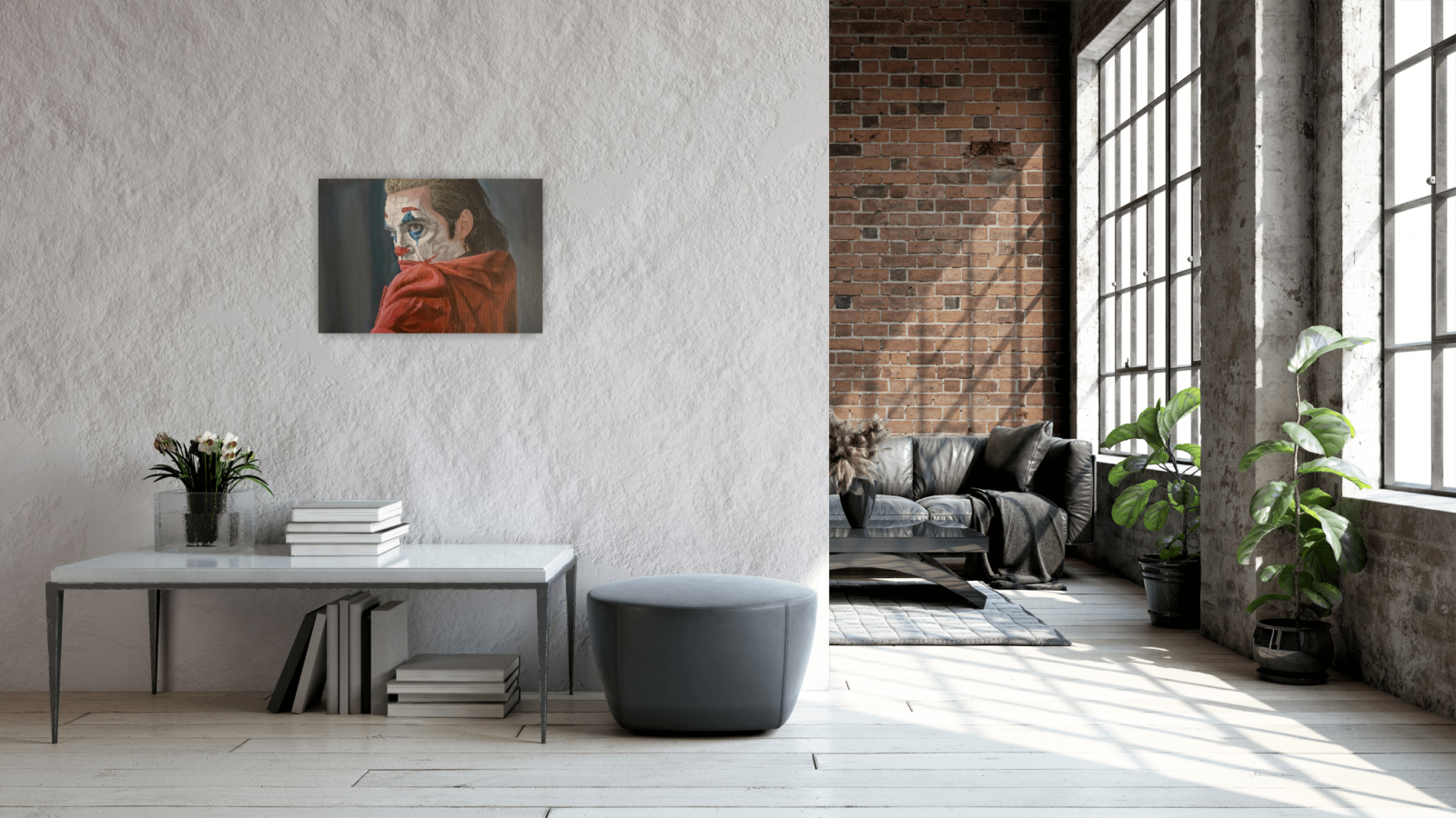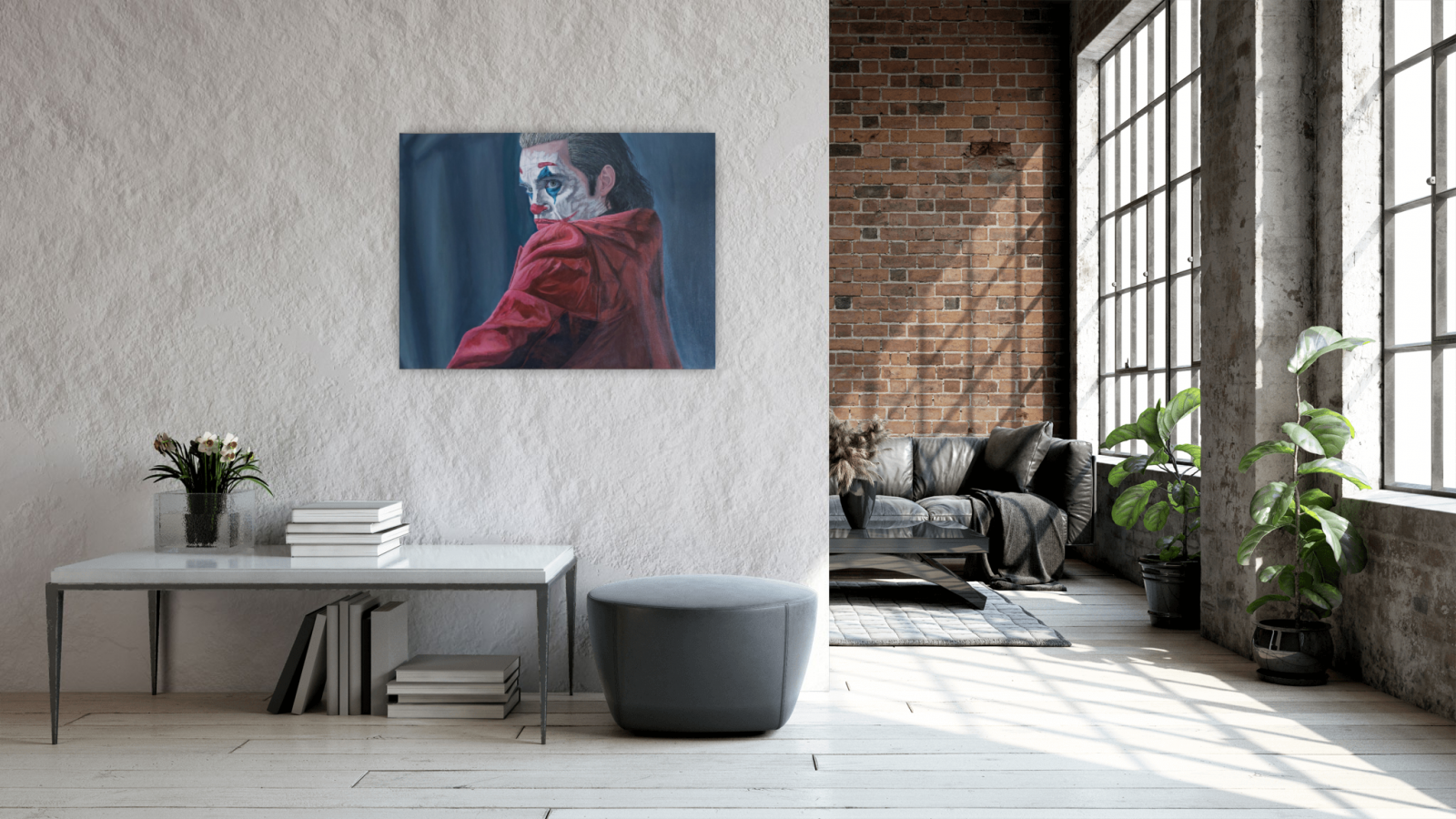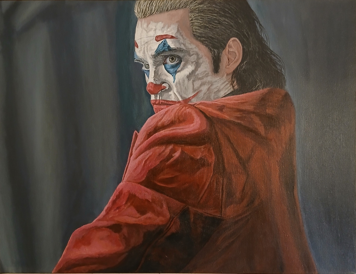 Inspiracją do namalowania Jokera, były dla mnie emocje jakie przedstawia główny bohater, jest on osobą z problemami psychicznymi ,rozchwiany emocjonalnie, zagubiony . Niestety nikt nie potrafił mu pomóc. Obraz namalowany jest farbami akrylowymi, boki obrazu są zamalowane na czarno, zabezpieczone werniksem. Z tyłu obrazu jest podpis wraz z datą utworzenia dzieła. Obraz jest gotowy do powieszenie ,posiada zamontowaną zawieszkę.