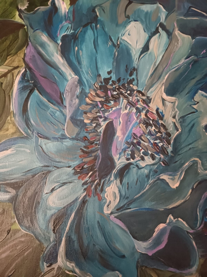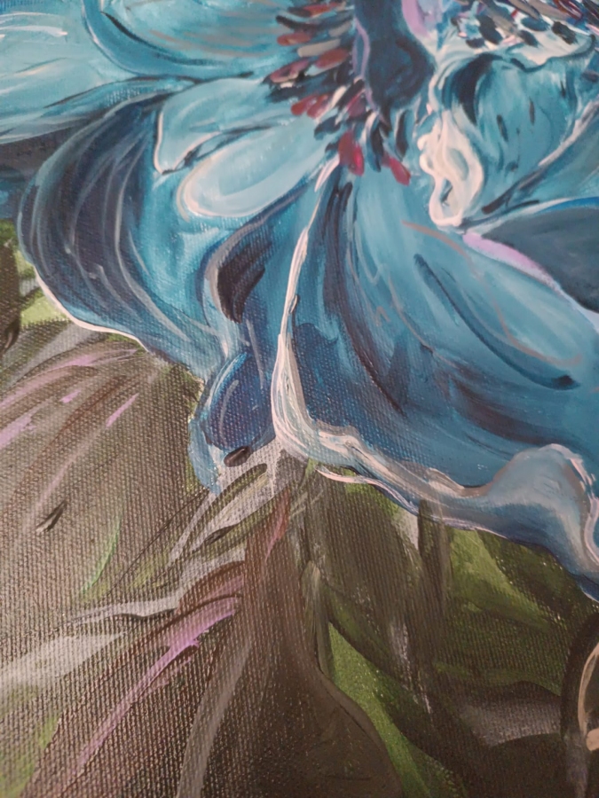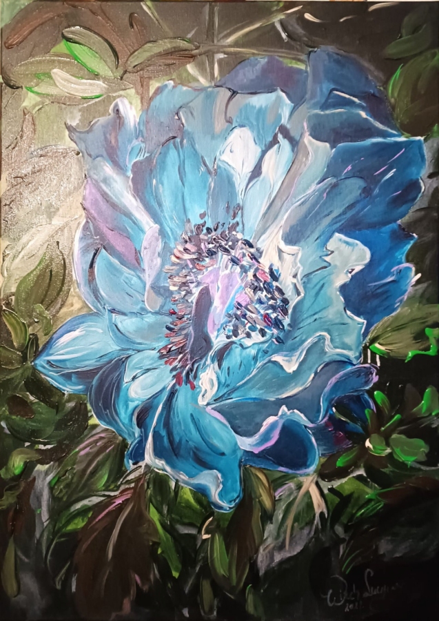Na obrazie widzimy duży, niebieski kwiat, który zdaje się rozkwitać w nieskończoność. Kolory są intensywne, od różnych odcieni niebieskiego po subtelne zielenie liści w tle. Płatki kwiatów mają delikatne, faliste krawędzie, które tworzą wrażenie miękkości i dynamiki. Kompozycja jest zrównoważona, a centralne umieszczenie kwiatu przyciąga wzrok widza. Atmosfera obrazu jest spokojna, ale jednocześnie pełna energii. Styl artysty przypomina impresjonizm z nutką ekspresjonizmu, dzięki odważnym pociągnięciom pędzla i swobodnemu użyciu barw. Dzieło emanuje spokojem, ale też fascynuje, jak każda kropla rosy skrywa tajemnicę. Można poczuć zapach tego kwiatu, prawie jakby był real. Jakby natura mówiła hello w najlepszy możliwy sposób. Obraz pozostawia odbiorcę z uczuciem zadumy, a jednocześnie radości. Refleksja nad obrazem prowadzi do myśli o pięknie ukrytym w prostocie natury. Tekstura płatków i liści przyciąga wzrok i dodaje głębi, budząc wyobraźnię.