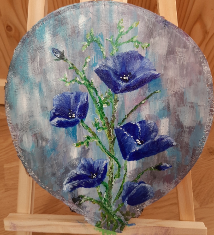 Piękny, ręcznie malowany okrągły obraz na drewnianym podłożu z brzozy, werniksowany, przedstawiający kwiaty na tle abstrakcyjnej, niebiesko-szarej kompozycji. Idealny jako dekoracja