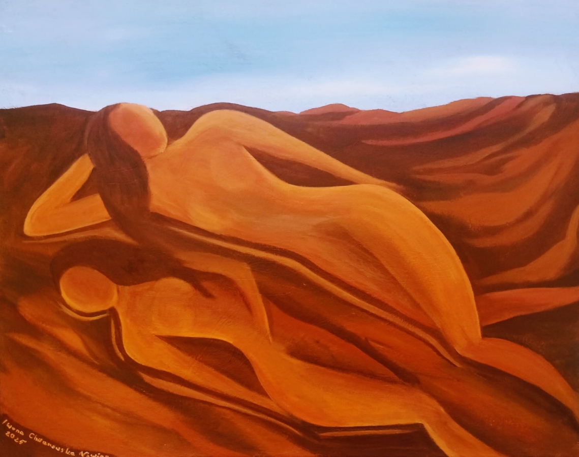 Obraz powstał bez planu. W trakcie malowania piasku, zaczęła wyłaniać się jedna postać kobiety i w miarę malowania obraz dopełnił się drugą postacią kobiecą.