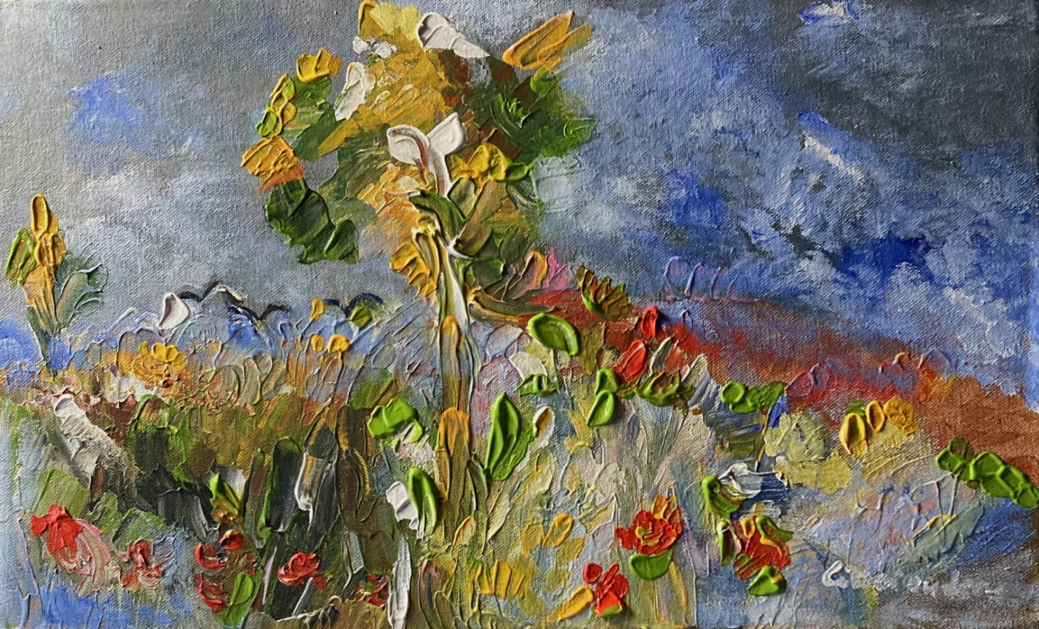 To leciutka impresja na temat holenderskiego krajobrazu i jego charakterystycznych barw. Przyciemnione niebo i podświetlona światłem przyroda mówi o silnej harmonii natury. Czerwień to tulipany, które dominują w krajobrazie i są symbolem życia. Obraz namalowany farbami akrylowymi na płótnie naklejonym na płytę, wykonany techniką impastu. Praca nieoprawiona.