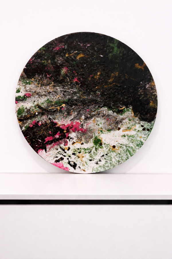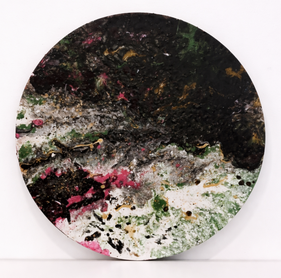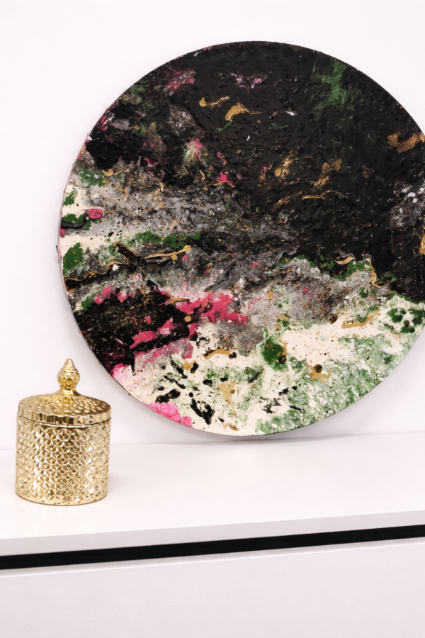 Okrągły, kolorowy obraz akrylowy o średnicy 50 cm. Abstrakcyjna kompozycja z różnymi odcieniami zieleni, różu i czerni, złota tworząca ciekawą, artystyczną całość. Wyjątkowe kolory i kształty wpasują się w jasne i ciemne wnętrza.
