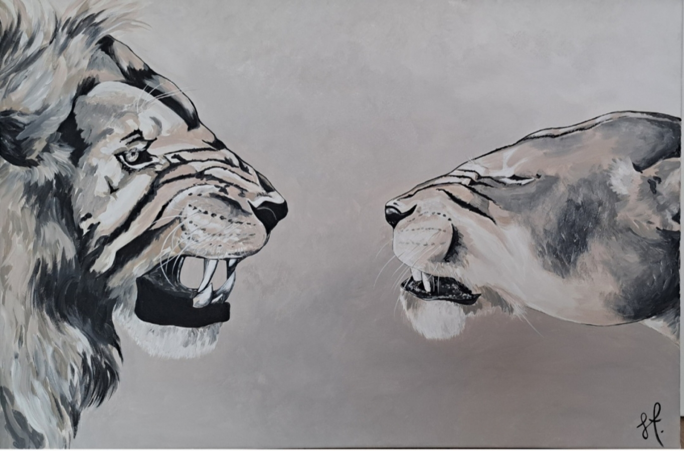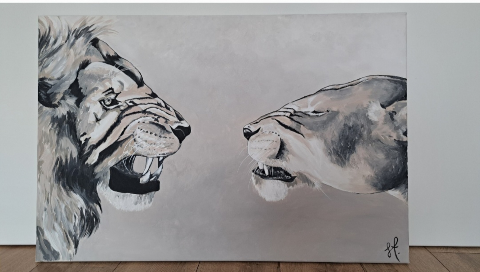 Jest to obraz minimalistyczny w odcieniach beżu I szarości. Przedstawia lwicę i lwa- ma on wymiar symboliczny. Przedstawia Konflikt damsko-męski. Malowany farbami akrylowymi na płótnie w rozmiarze 60×90