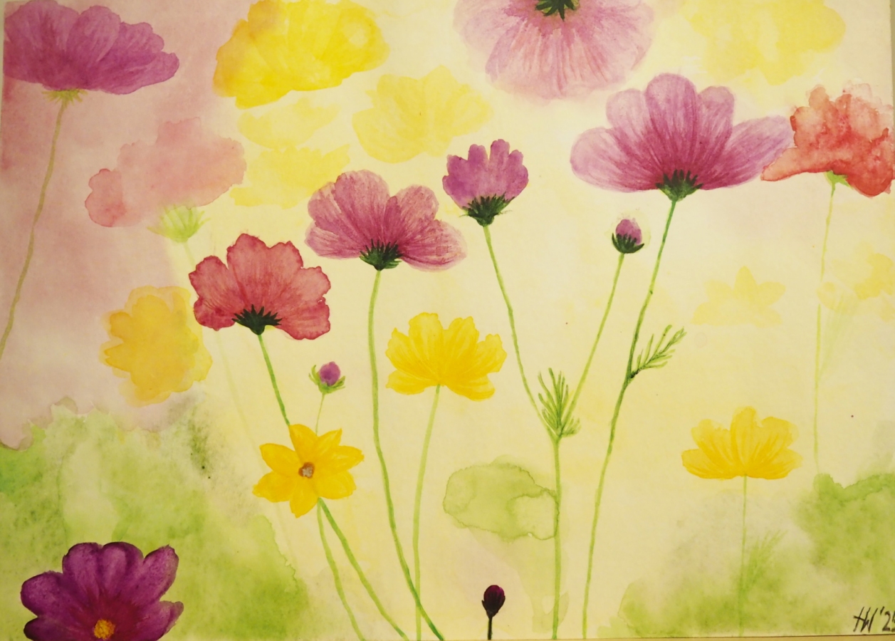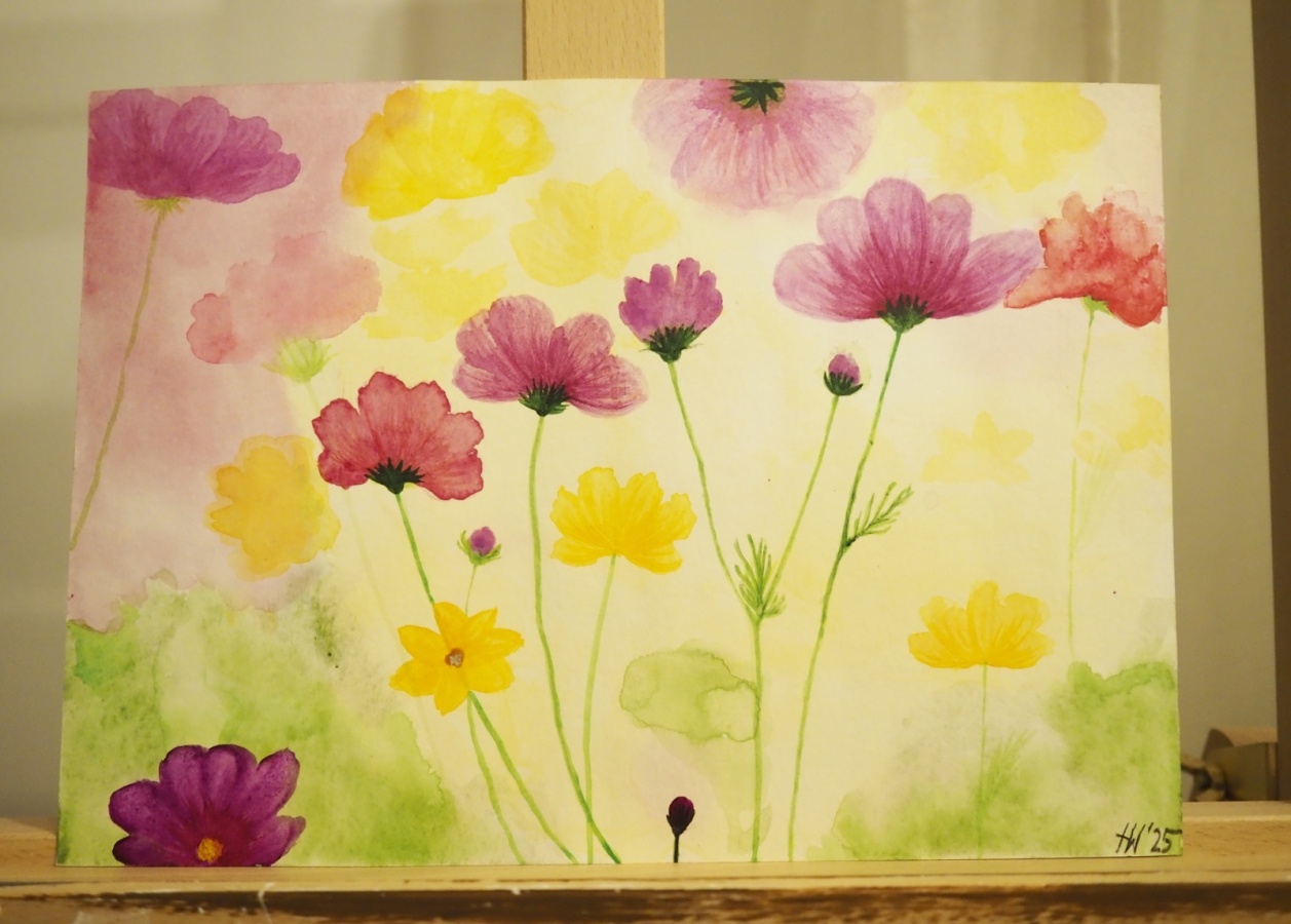 Delikatny i wąski kadr z bardzo rozmytym tłem prosto z babcinego ogrodu. Akwarela Sonnet na papierze 320g. bardzo prosta forma, bez ramki, bez werniksu czy wosku. Można oprawić w ramkę samemu. Motyw? Autorka tęskni za latem na wsi, gdzie zbierała kosmosy wielkosci 1,5m, które rosły u matki w ogrodzie warzywnym.