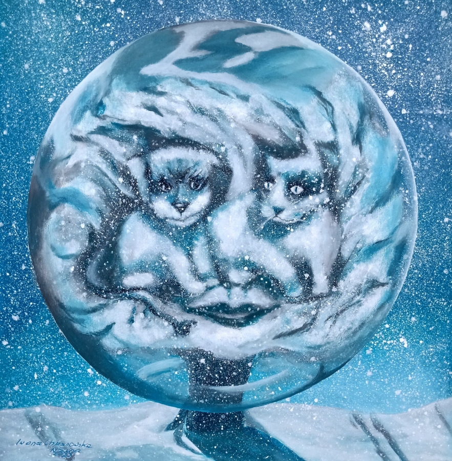 Obraz nieoczywisty. Z daleka widać twarz człowieka, w przybliżeniu to pies i kot składają się w części na to oblicze. Wszystko zamknięte w kuli, w zimowej scenerii. Obraz namalowany farbami akrylowymi na płótnie, boki są zamalowane, zamontowana zawieszka.