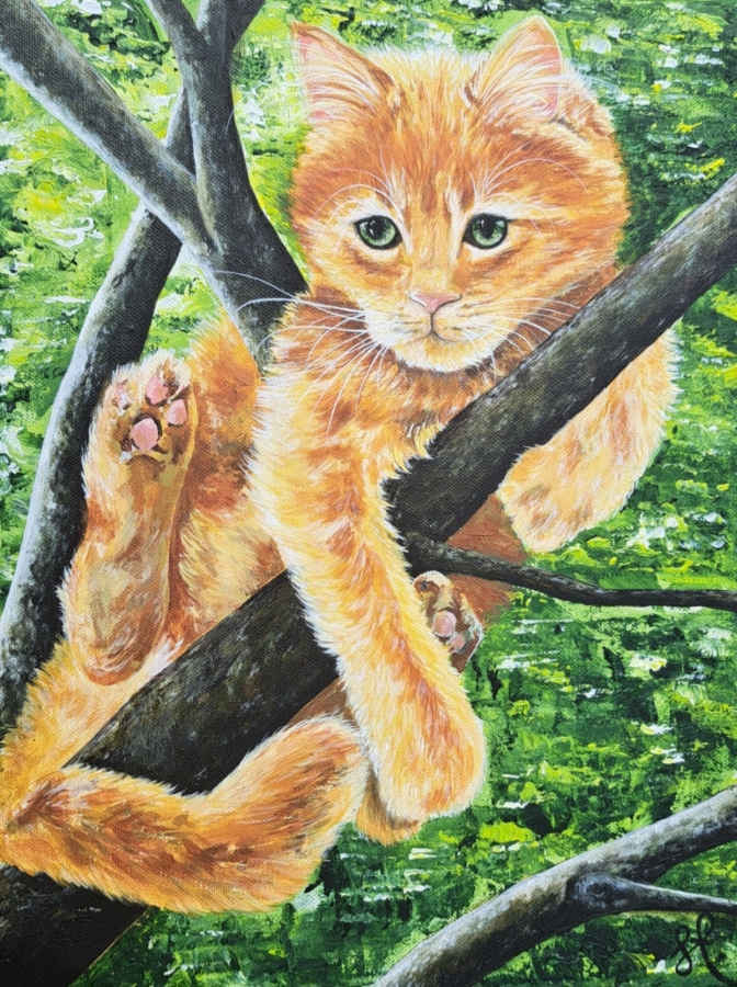Obraz przedstawia rudego kotka na drzewie. Jest malowany farbami akrylowymi na płótnie w rozmiarze 40×30.