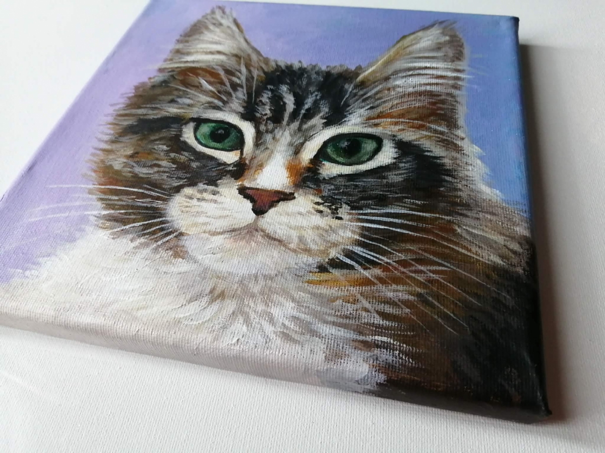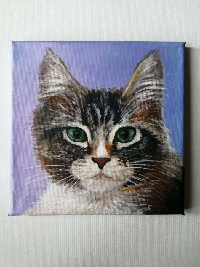 Obraz przedstawia brązowego kota na fioletowym tle. Skupienie się na detalu twarzy pozwala poczuć jego charakter, delikatność i tajemniczość. Gra kontrastów między ciepłym brązem futra a chłodnym fioletem tła sprawia, że spojrzenie kota przyciąga wzrok i budzi emocje. Idealny dla miłośników kotów oraz osób szukających dekoracji pełnej wyrazu i uroku. Sygnowany na rewersie.