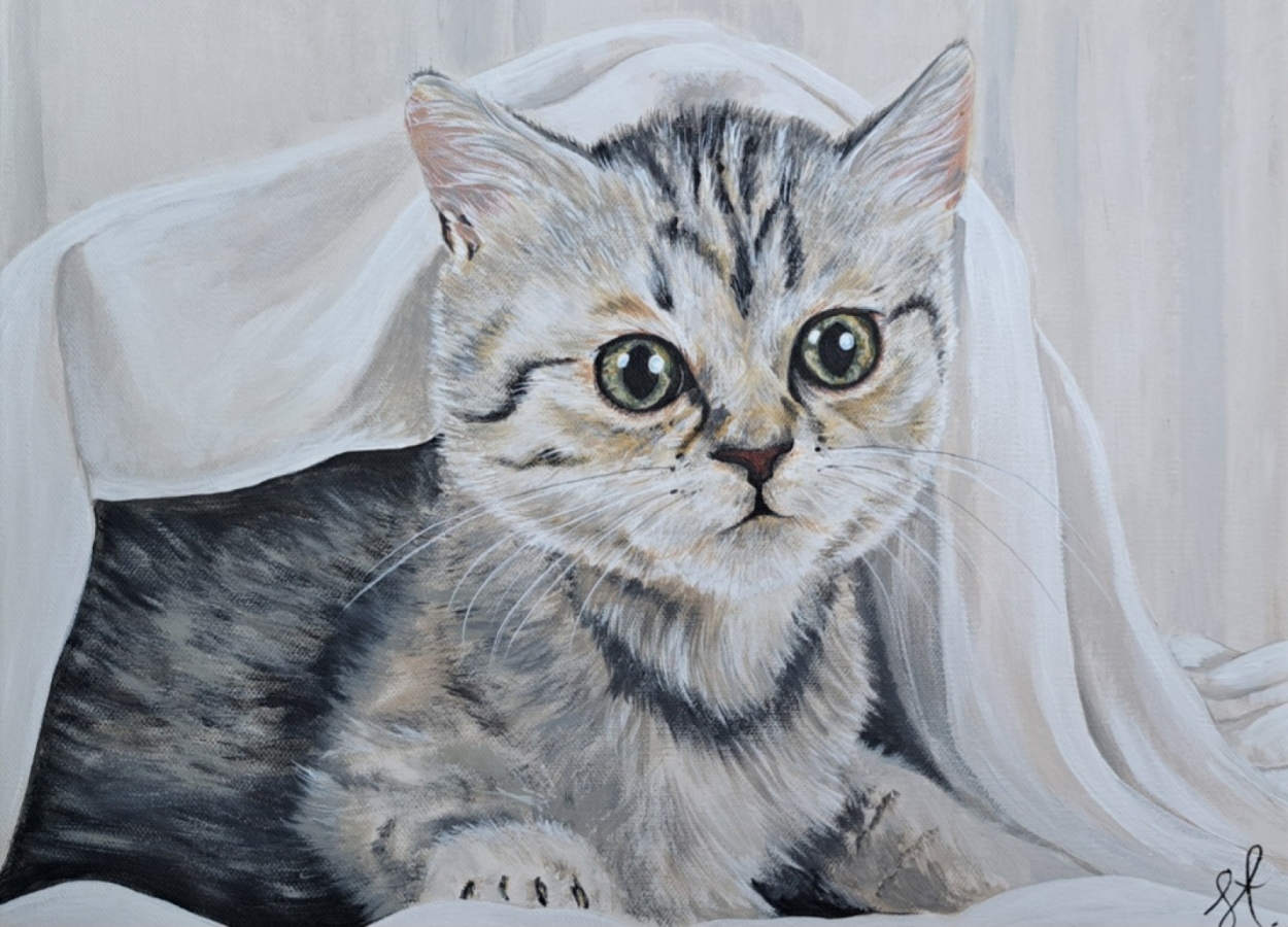 Obraz przedstawia uroczego małego kotka. Doskonały na prezent dla miłośników kotków lub do pokoju dziecka. Malowany farbami akrylowymi na płótnie w rozmiarze 30×40.
