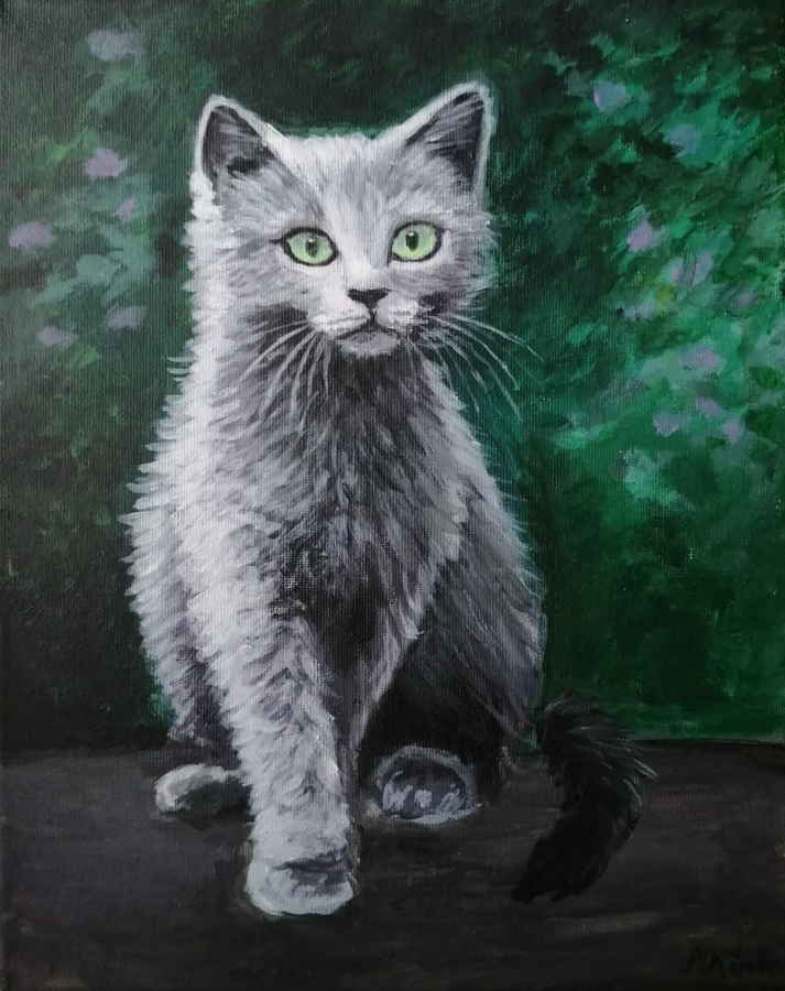 Szary kot ukryty wśród bujnej zieleni przyciąga uwagę swoim spokojem i uważnym spojrzeniem. Obraz łączy w sobie harmonię natury i subtelną obecność zwierzęcia, tworząc nastrojową, wyciszającą kompozycję. Idealny do wnętrz, które potrzebują odrobiny natury i ciepła.
