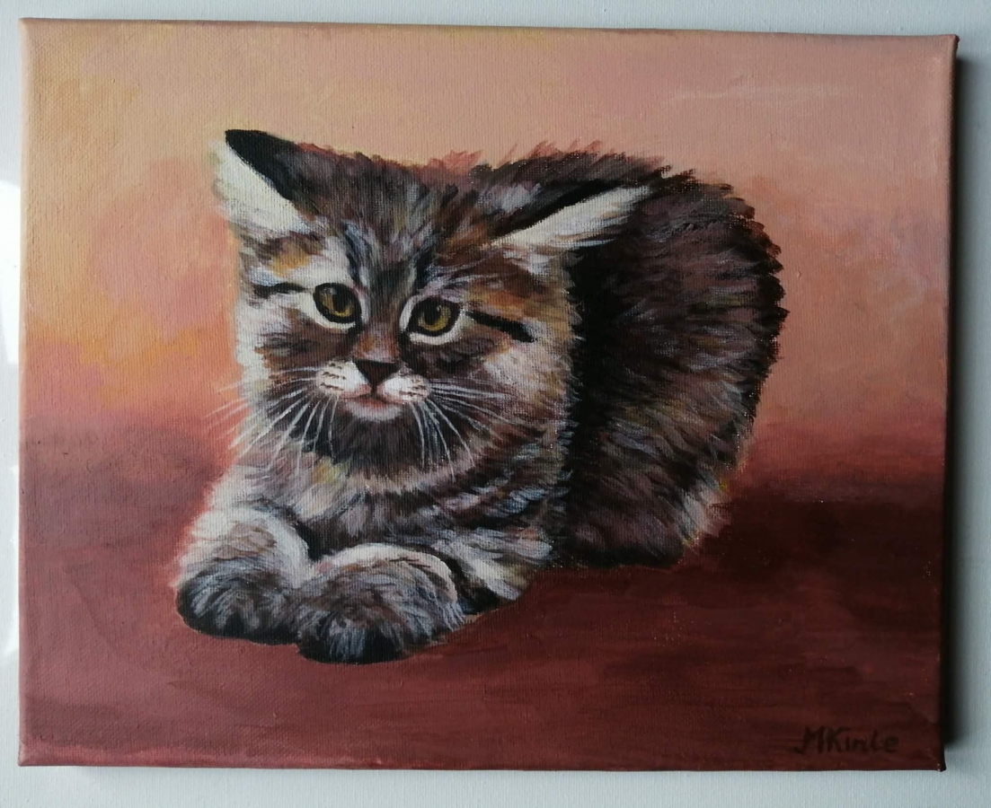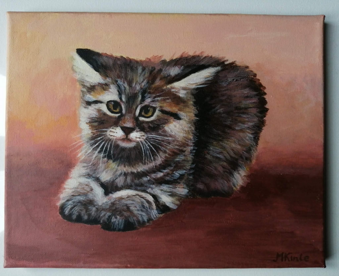Obraz przedstawia burego kota ukazanego w ciepłej palecie różu i pomarańczu. Delikatne przejścia kolorów otulają sylwetkę zwierzęcia, nadając kompozycji przytulny i harmonijny charakter. To połączenie naturalności i barwnej ekspresji sprawia, że praca wnosi do wnętrza ciepło i spokój.