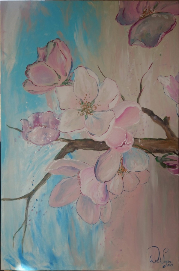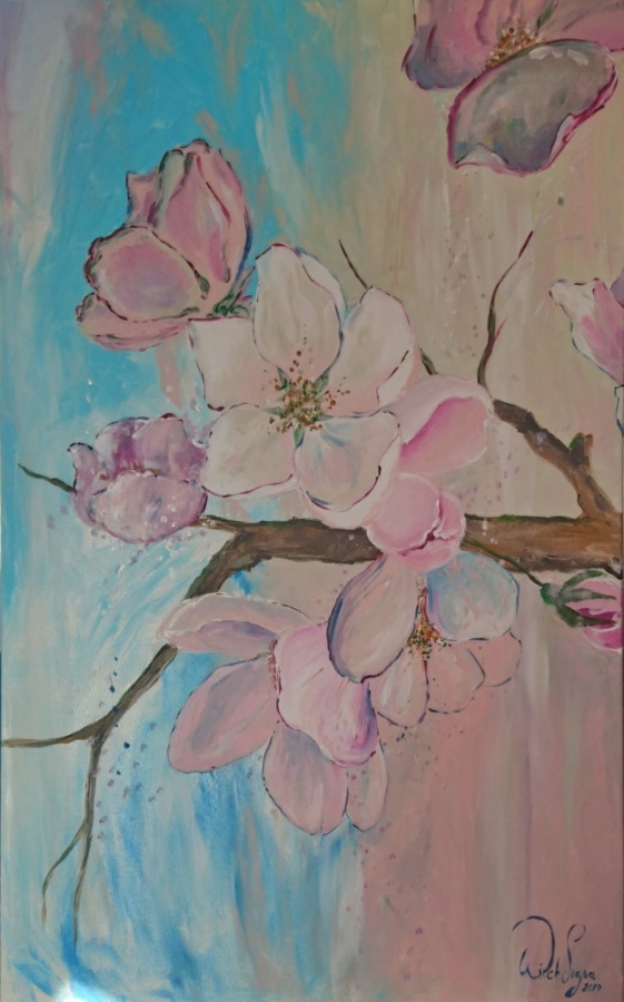 Na obrazie mamy piękne kwiaty wiśni, delikatnie kołyszące się na tle błękitnego nieba. Płatki są subtelnie różowe, z nutą bieli, a ich miękkie kontury sprawiają, że całość wygląda zjawiskowo. Gałąź, na której kwiaty rosną, zdaje się być solidnym punktem odniesienia, pełnym naturalnej harmonii. Czuć tu powiew świeżości wiosennego poranka. Atmosfera całego obrazu jest spokojna i łagodna, emanuje z niego delikatność natury. Artysta wykorzystał technikę impastu, delikatnie nakładając farbę, co nadaje obrazowi głębi. Kompozycja jest przemyślana i zbalansowana, przyciągając wzrok oglądającego w głąb sceny. I tak sobie myślę, patrząc na to dzieło, że to taki jeden z tych momentów, które chciałbyś zatrzymać na zawsze. Można się zastanawiać, czy autor chciał oddać chwilę ulotności, zatrzymując kwiaty w pełnym rozkwicie. Może to nostalgia za wiosennymi wspomnieniami? A może po prostu zachwyt nad pięknem przyrody. Obraz jest pełen pastelowych tonów, co dodaje mu lekkości, a jednocześnie pewnej subtelnej elegancji. Trochę jak niewinny sen w pastelowych barwach. Dreamlike, można by rzec. Ta praca z pewnością wprawi niejednego odbiorcę w chwilę refleksji.