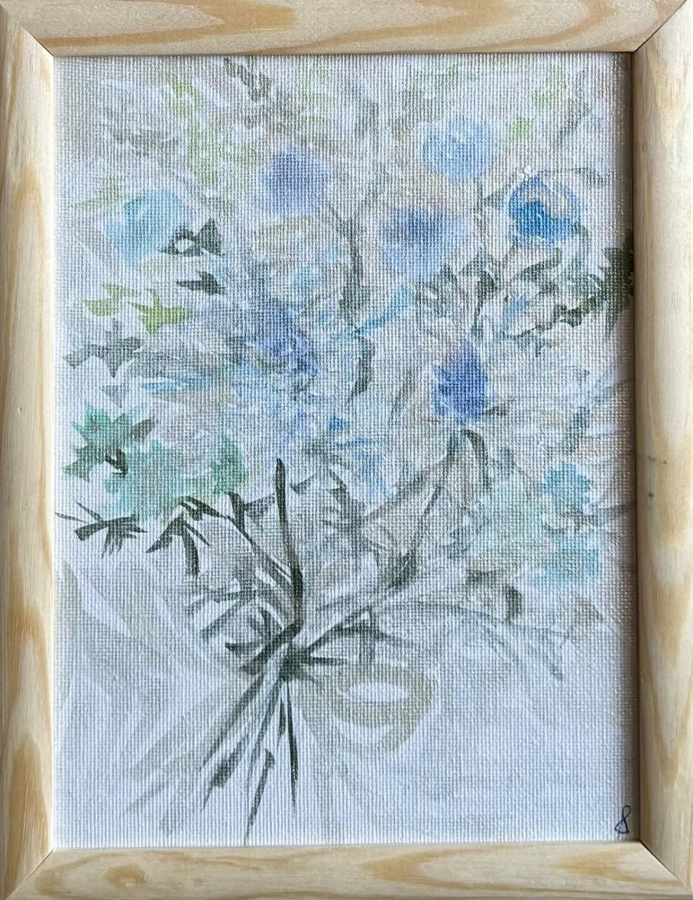 Kwiaty z nutą melancholii. „Kwiaty w melancholii” to delikatny i nastrojowy obraz, który emanuje spokojnym, introspektywnym nastrojem. Kompozycja przedstawia bukiet delikatnych, błękitnych kwiatów otoczonych stonowaną zielenią liści, delikatnie wtapiających się w blade, teksturowane tło. Dominują chłodne barwy – różne odcienie błękitu, szarości i subtelnej zieleni – które tworzą wrażenie spokoju i emocjonalnej głębi. Pociągnięcia pędzla są lekkie i półprzezroczyste, co pozwala formom wydawać się lekko rozmyte, niemal jakby zanikały w pamięci. Kwiaty wydają się delikatne i zwiewne, dając wrażenie bezruchu i kontemplacji. Tekstura tła dodaje subtelnej złożoności, wzmacniając melancholijną atmosferę dzieła.