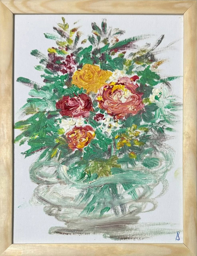 Kwiaty, ujęte w bukiet w wazonie. „Kwiaty w wazonie” to żywy i ekspresyjny obraz przedstawiający bogaty bukiet ułożony w przezroczystym naczyniu. Kompozycja jest pełna ciepłych tonów, w tym soczystych czerwieni, jaskrawej pomarańczy i nut złocistej żółci, pośród bujnej zieleni liści. Kwiaty zostały namalowane odważnymi, energicznymi pociągnięciami pędzla, które dodają im objętości i witalności. Zieleń rozchodzi się dynamicznie, dodając kompozycji ruchu i pełni. Wazon charakteryzuje się luźnymi, wirującymi liniami, tworząc wrażenie lekkości, a nie jednolitości formy. Kontrast między żywymi kwiatami a delikatnym, białym tłem sprawia, że kolory pięknie się wyróżniają. Ogólne wrażenie jest spontaniczne i emocjonalne, odzwierciedlając impresjonistyczne podejście skoncentrowane na kolorze i atmosferze.