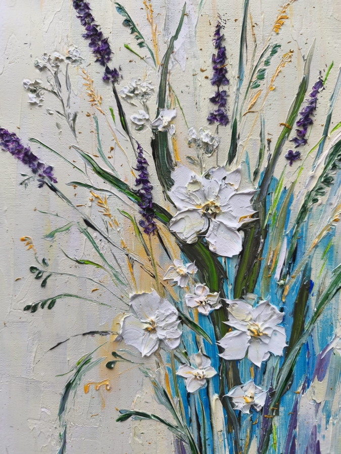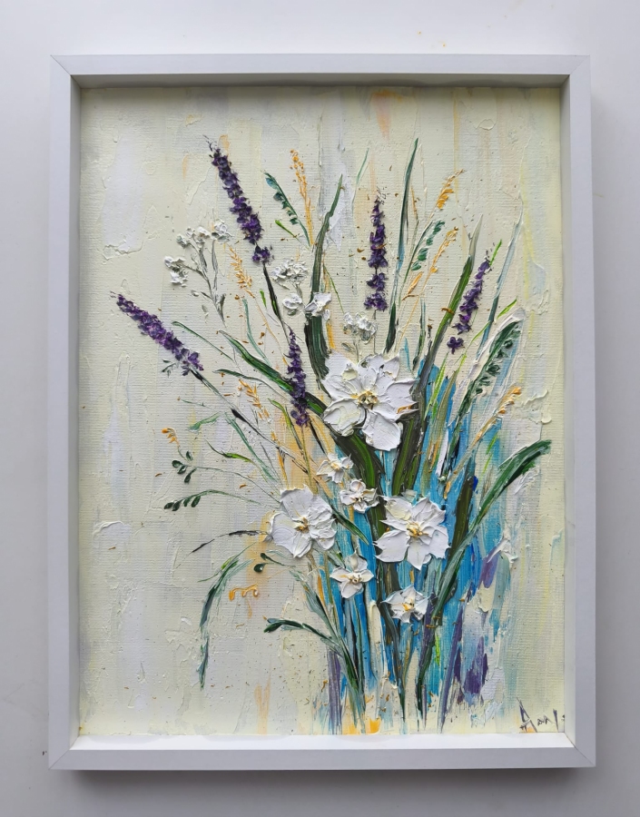 Witam, obraz Kwiaty namalowaty na płycie malarskiej, olejnymi farbami, szpachlą w technicy impasto, rozmiar 30x40, posiada białą ramkę.