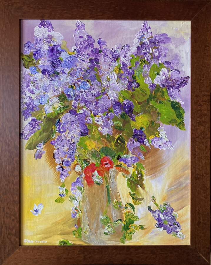 W obrazie przeważają fiolety , lawendy i zielenie z akcentami czerwieni i bieli z pomocą których powstał obraz zgodny z moimi odczuciami. Kwitnące bzy zostały wykonane w stylu ekspresjonistycznym z elementami realizmu. Obraz został wykonany w technice głębokiego impastu farbami akrylowymi na bawełnianym płótnie naklejonym na płytę. Oprawiony jest w drewnianą ramę koloru ciemny brąz o szerokości 5 cm.