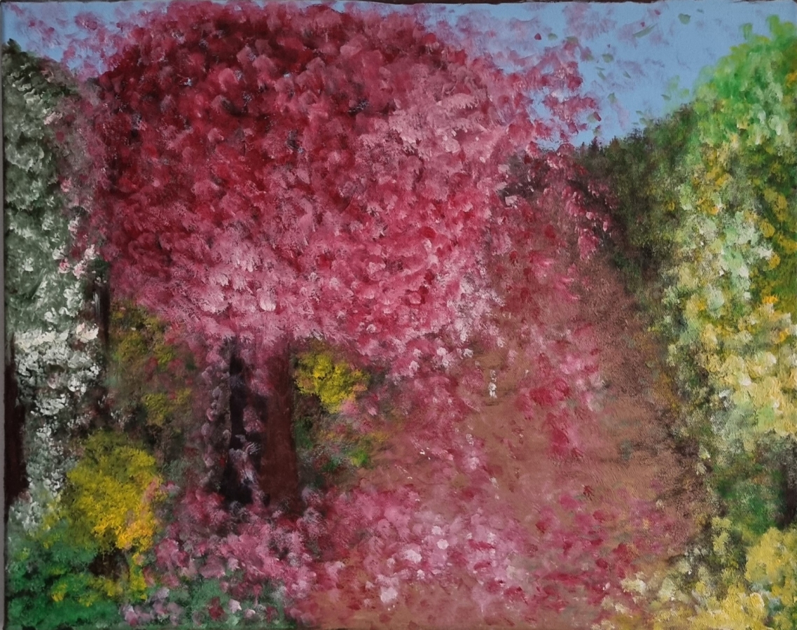 Obraz przedstawia pejzaż wiosenny. Bujna scena ogrodu przedstawia duże kwitnące drzewo o intensywnie różowych kwiatach. Obraz ma wyraźną impresjonistyczną teksturę. Posiada żywy i dynamiczny charakter. Centralnie przedstawione drzewo mini się odcieniami różu kwiatów. Opadające, rozsypane kwiaty tworzą kwicisty dywan. W tle widoczne zielone krzewy. Widoczny ciemny pień drzewa kontrastuje z jasnymi kwiatami, a ścieżka kieruje odbiorcę w głąb obrazu.