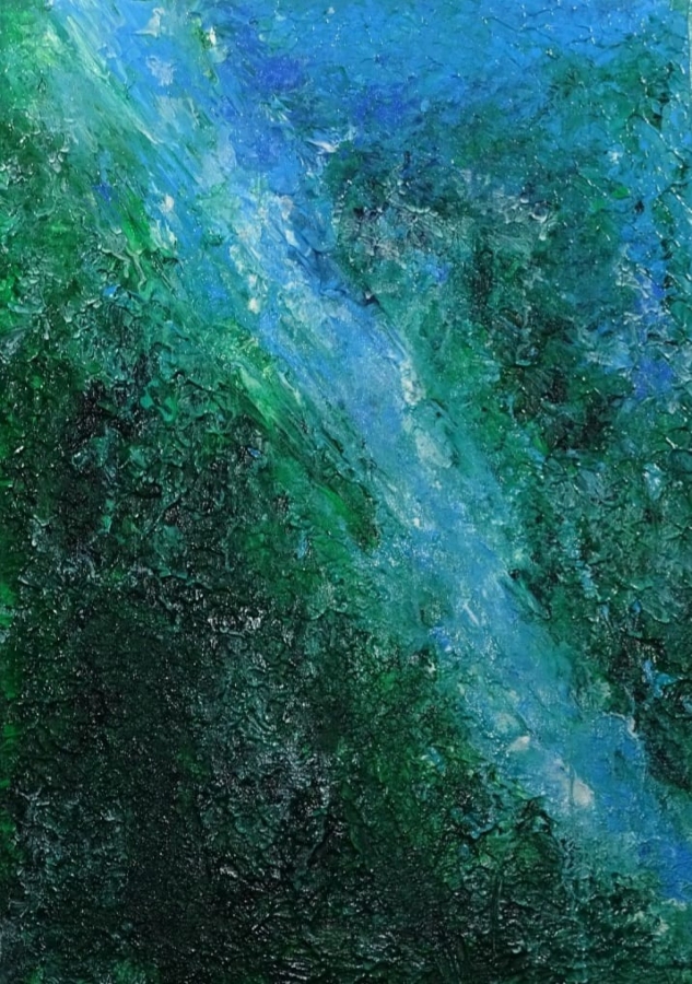 Praca jest wykonana techniką impastu na płótnie bawełnianym naciągniętym na drewniany blejtram. Artysta zastosował farby akrylowe o intensywnych pigmentach oraz strukturalne medium modelujące, które nadaje powierzchni wyraźną fakturę i trójwymiarowy charakter. Grube warstwy farby tworzą organiczną strukturę przypominającą pejzaż widziany z dużej wysokości – złożoną z odcieni zieleni, błękitów i turkusu. Las z lotu ptaka przenosi odbiorcę w przestrzeń natury widzianej z perspektywy nieba – tam, gdzie kolory drzew stapiają się z cieniem chmur, a promienie słońca przebijają się przez gęstwiny korony lasu. Kompozycja symbolizuje połączenie chaosu i harmonii, oddając energię życia zaklętą w strukturach natury. Dzieło najlepiej zaprezentuje się w przestronnych wnętrzach – salonie, biurze, galerii lub miejscu odpoczynku, wprowadzając atmosferę świeżości i głębi. To wyjątkowy przykład sztuki nowoczesnej, łączący rękodzieło artystyczne z emocjonalną ekspresją.