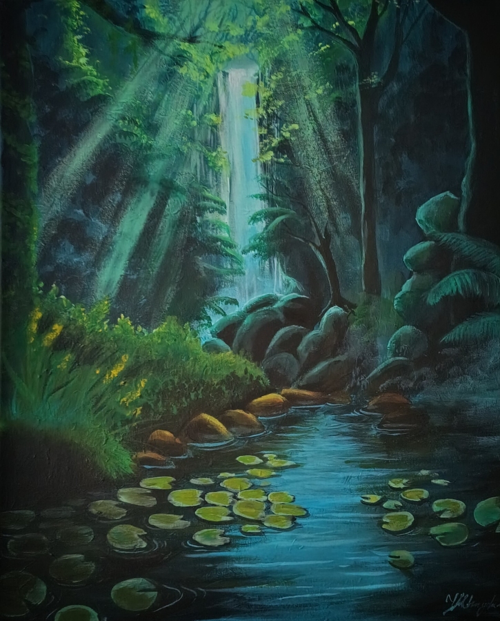 Inspiracją do tego obrazu była wizyta na Maderze i wycieczki po lewadach (dostarczających wodę rynnach, wiodących z wyższych do niższych części wyspy), z których niemal każda kończyła się zapierającym dech w piersiach wodospadem. Spokojny, wilgotny las, pokryty mchem i paprociami, wypełniony chlupotem płynącej wody i przepuszczonym przez drzewa światłem. W tle znajduje się wodospad, zasilający pierwszoplanowe jeziorko, którego powierzchnia pokryta jest liśćmi lilii wodnych. Praca została wykonana farbami akrylowymi na płóciennym podobraziu, podklejonym drewnianą ramą. Boki obrazu są pomalowane na czarno.
