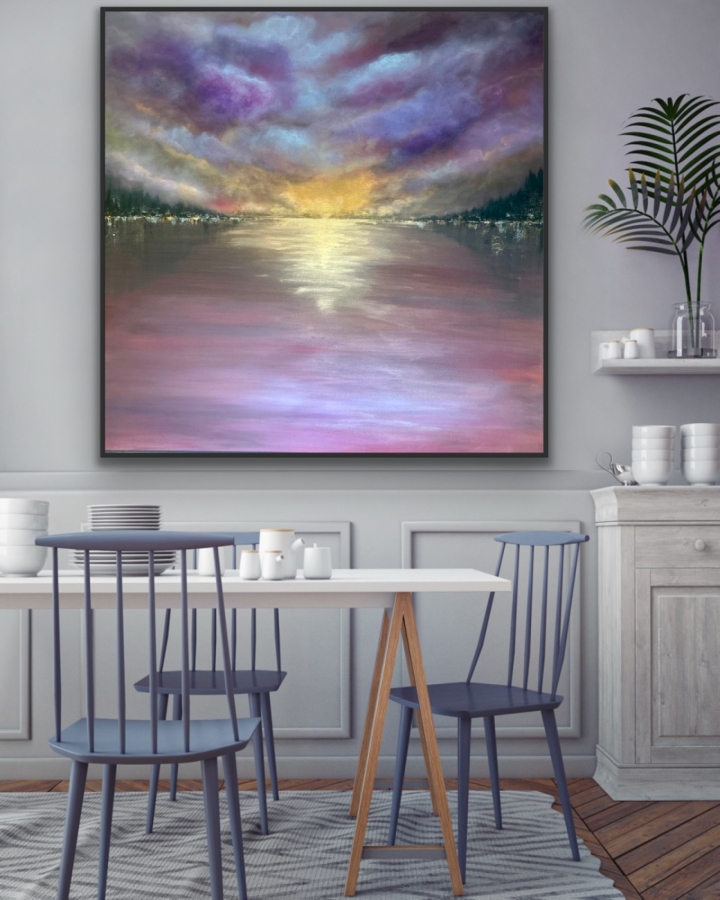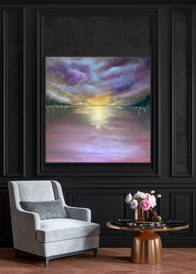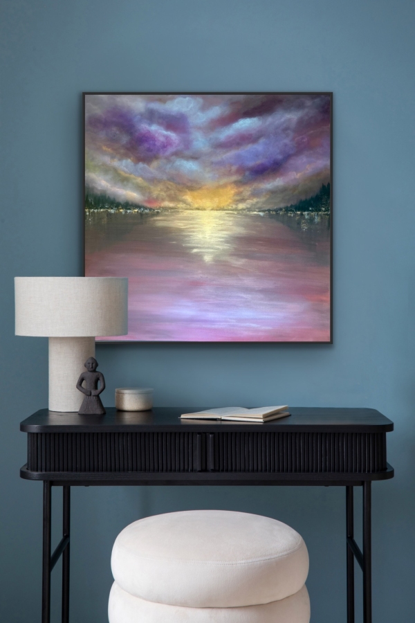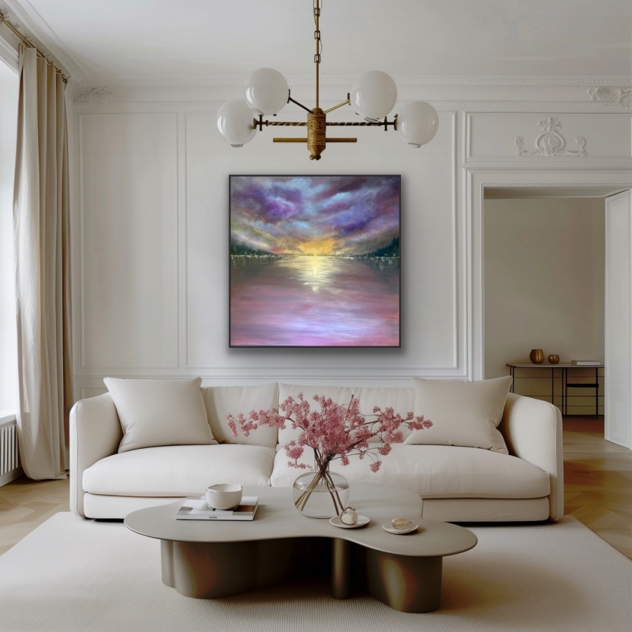 „Luminous Horizon” to nastrojowy pejzaż, w którym blask przebijającego się światła spotyka się z dramatyczną dynamiką nieba. Miękkie przejścia różu, fioletu i złota budują atmosferę spokoju przeplatanego subtelnym napięciem. Lustrzane odbicia na tafli wody prowadzą wzrok ku centrum kompozycji, tworząc iluzję głębi i lekkości. Obraz emanuje ciepłem i medytacyjnym charakterem, wprowadzając do wnętrza harmonię i przestrzeń. Idealny do nowoczesnych aranżacji, przestrzeni wypoczynkowych i miejsc, w których liczy się spokojna, a zarazem wyrazista obecność sztuki. Gotowy do powieszenia