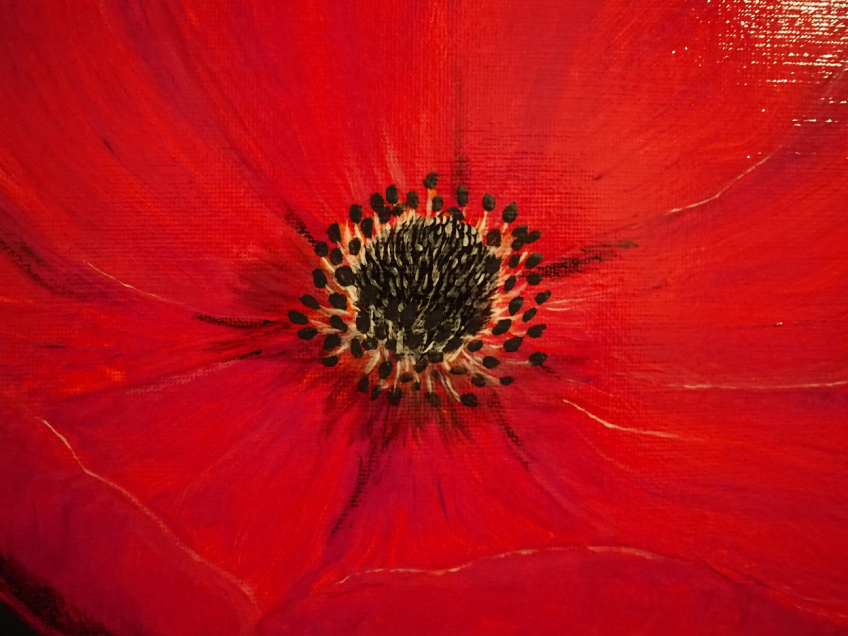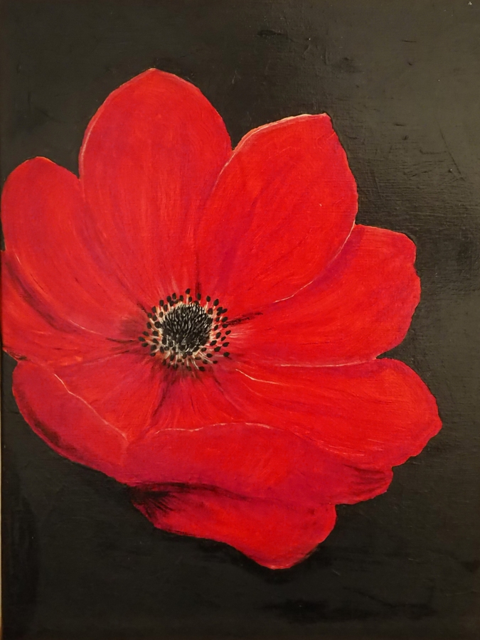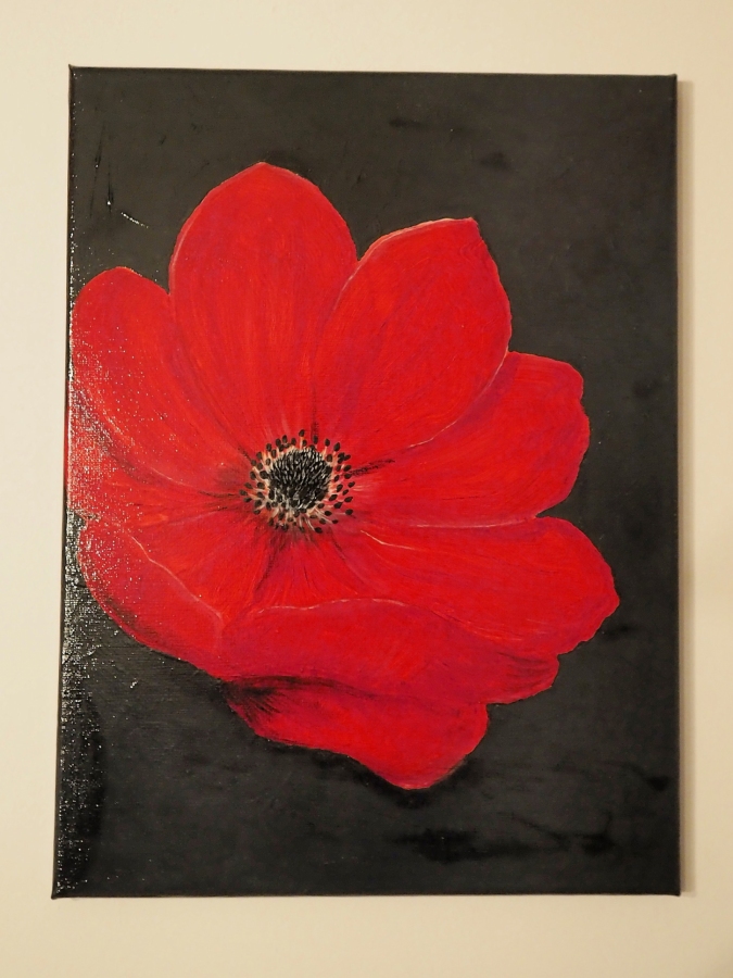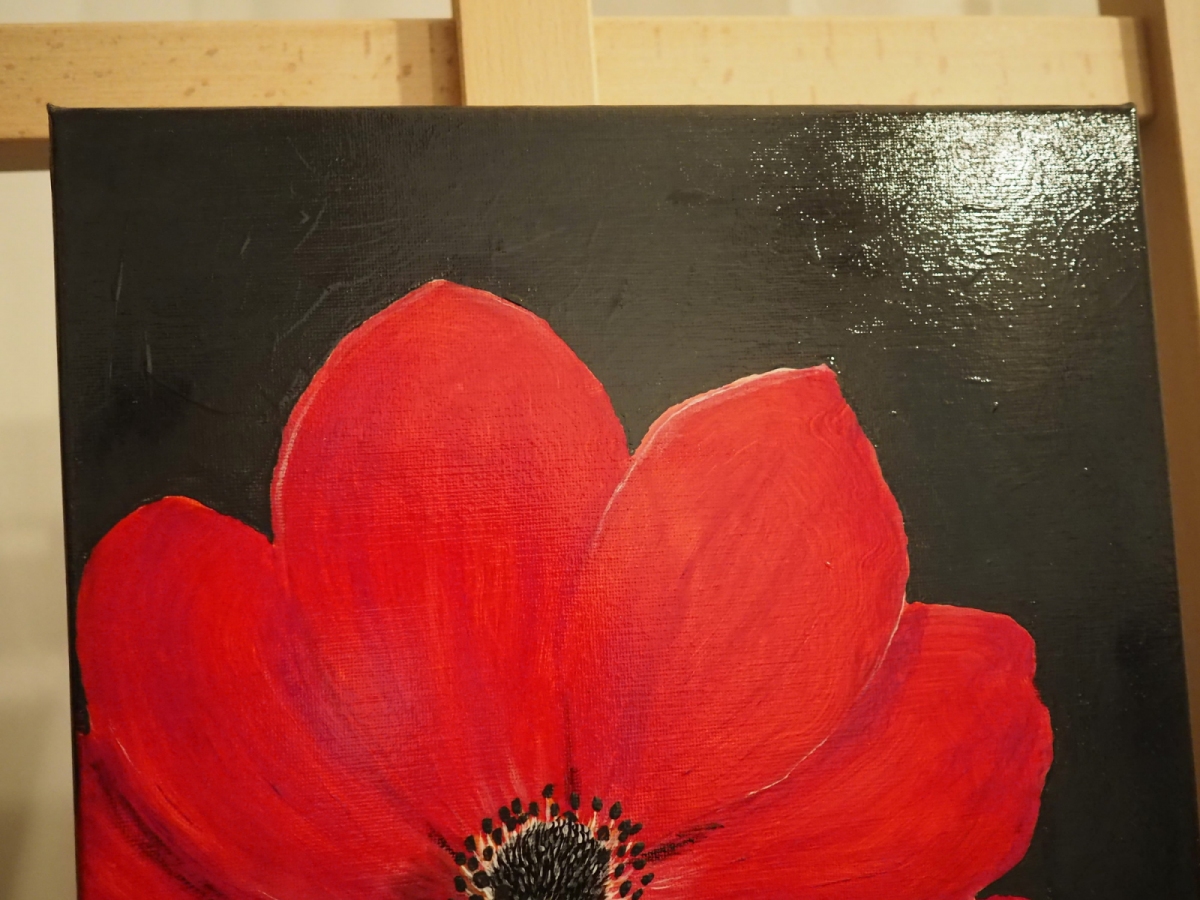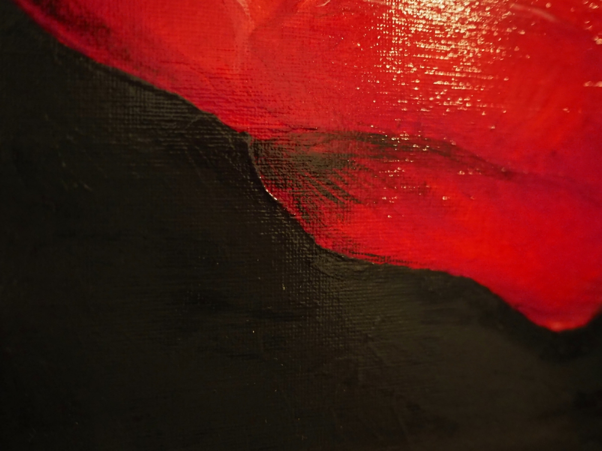"Maczek" powstał jako pierwszy obraz w dużym formacie. Akryl na płótnie z podwójnym werniksem. Eksperymentem było tu dodanie cieni w identycznym odcieniu grafitu po pierwszym werniksie. W tym obrazie uchwycono trójwymiar i światłocień z pomocą jedynie czterech kolorów. Warto tu zwrócić uwagę na dopracowany detal i widoczne ostrzejsze pociągnięcia pędzla. Obraz dedykowany jest dla osób szukających ożywienia wnętrza sztuką nowoczesną. Z racji intensywnego kontrastu piwoniowej czerwieni i grafitu doda ekspresji do łagodnych tonacji nowoczesnego wnętrza.
