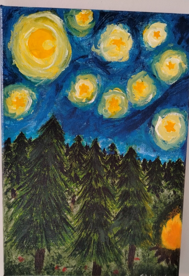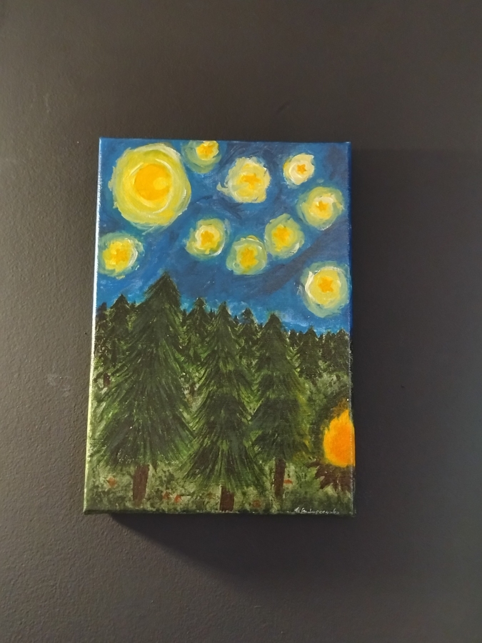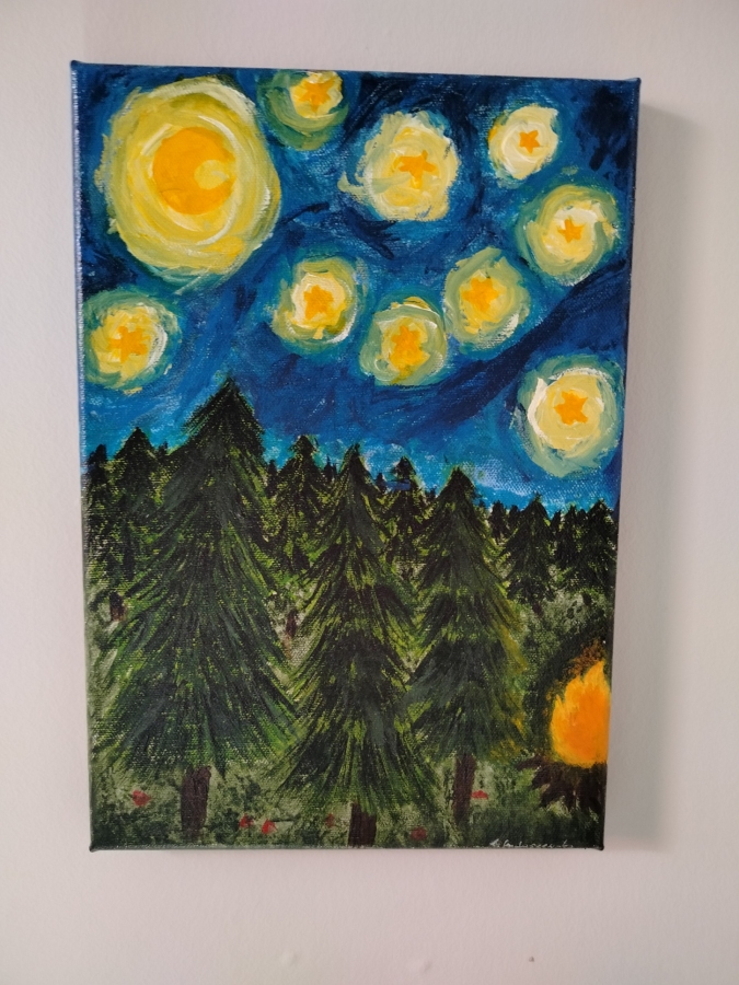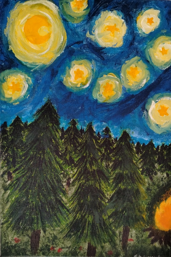 Obraz przedstawia nocny pejzaż leśny pełen energii i życia, ukazany w ekspresyjnej, niemal impresjonistycznej manierze. W centrum kompozycji znajdują się wysokie, ciemnozielone świerki, nad którymi rozciąga się rozgwieżdżone niebo pełne wirujących, złocisto-żółtych gwiazd inspirowanych Van Goghiem. Ich dynamiczne, spiralne formy przywodzą na myśl emocjonalne interpretacje natury i jej potężnej siły. Praca została wykonana techniką farb akrylowych na płótnie bawełnianym naciągniętym na drewniane krosno malarskie. Grubsze pociągnięcia pędzla oraz wyrazista faktura farby nadają dziełu głębi i ekspresji, a intensywne kontrasty barw — ciemnej zieleni lasu i świetlistych tonów żółci oraz błękitu — budują wrażenie ruchu i blasku. Inspiracją do powstania obrazu była noc w lesie, rozświetlona ogniskiem i gwiazdami, chwila bliskości z naturą, w której człowiek odczuwa zarówno spokój, jak i potęgę otaczającego świata. Obraz emanuje ciepłem i pozytywną energią, zachęcając do zatrzymania się i spojrzenia w górę — ku niebu pełnemu światła. Dzieło doskonale sprawdzi się jako obraz do salonu, sypialni lub gabinetu, wprowadzając do wnętrza aurę natury i artystycznego wyrazu. To także świetny obraz na prezent dla miłośników przyrody, barwnej ekspresji i sztuki nowoczesnej.