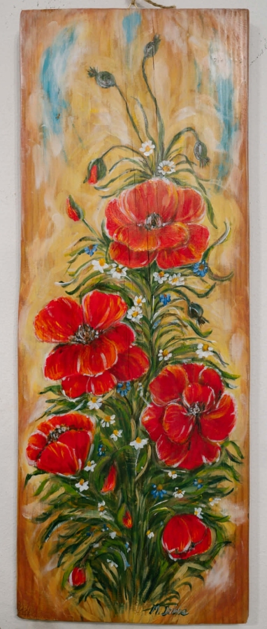 Praca wykonana napostarzałej desce przedstawia motyw czerwonych maków. Intensywna czerwień kwiatów wnosi energię i emocje. Praca własna wykonana farbami akrylowymi, zabezpieczona werniksem satynowym. Będzie przepiękną dekoracją w rustykalnym wnętrzu.