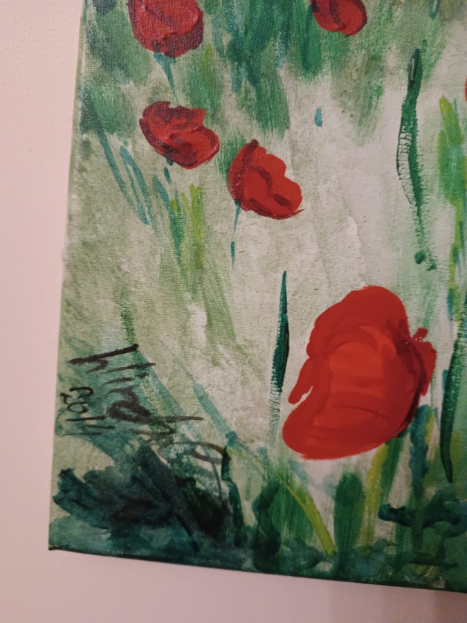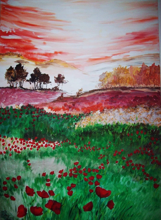 Akryl na płótnie, zawerniksowany, obraz ma zamalowane boki. Obraz emanuje cudowną, letnią atmosferą pełną kolorów i życia. Rozległe pole maków, które w intensywnych odcieniach czerwieni wygląda jak dywan. Przemieszczając wzrok w kierunku horyzontu, widzimy drzewa skąpane w miękkim świetle zachodzącego słońca. Niebo mieni się ciepłymi barwami pomarańczu, różu i złota, które zdają się płynnie przechodzić jedno w drugie. Użyłam techniki akwareli, aby stworzyć delikatne, rozmyte kształty, które dodają obrazu lekkości. Sposób, w jaki zostały uchwycone kolory, sprawia, że obraz wydaje się wręcz idylliczny. Patrzę na to i czuję, jakby czas się zatrzymał. Klimat obrazu jest spokojny, niemal senny. Wyobraź sobie letni dzień spędzony na pikniku w takim miejscu, gdzie jedynym dźwiękiem jest szum wiatru. W dziele jest coś, co przyciąga uwagę i jednocześnie uspokaja. Obraz budzi tęsknotę za naturą, za chwilami spędzonymi na świeżym powietrzu. Imponujące jest również, jak drobne pociągnięcia pędzla potrafią wywołać tak silne wrażenie. Obraz ten to prawdziwe okno do serca przyrody.