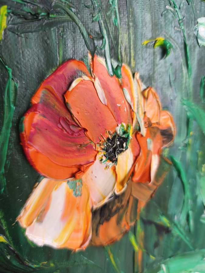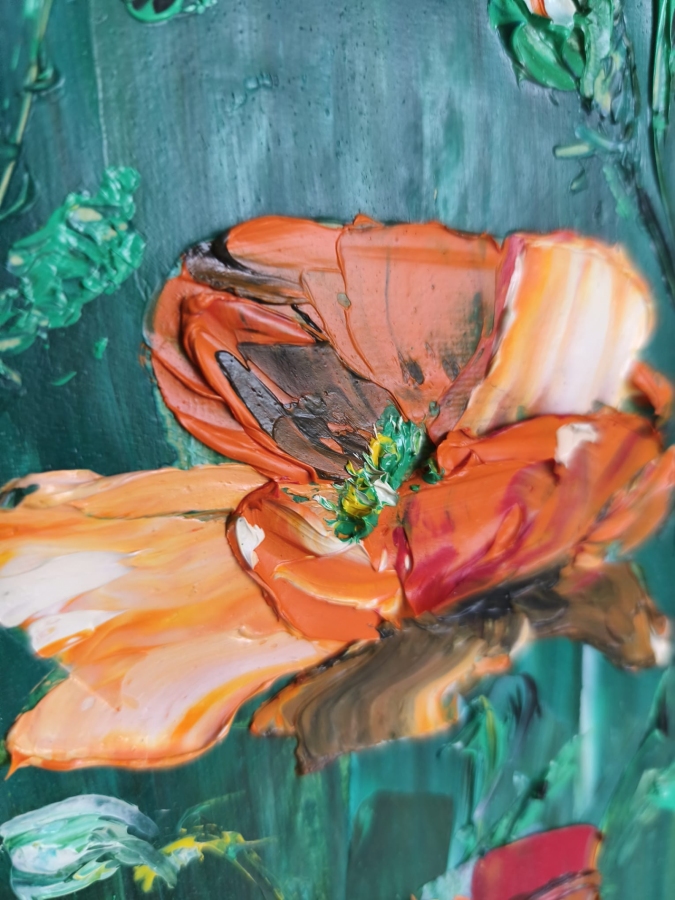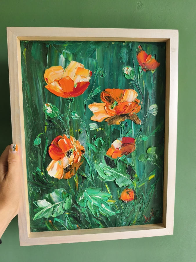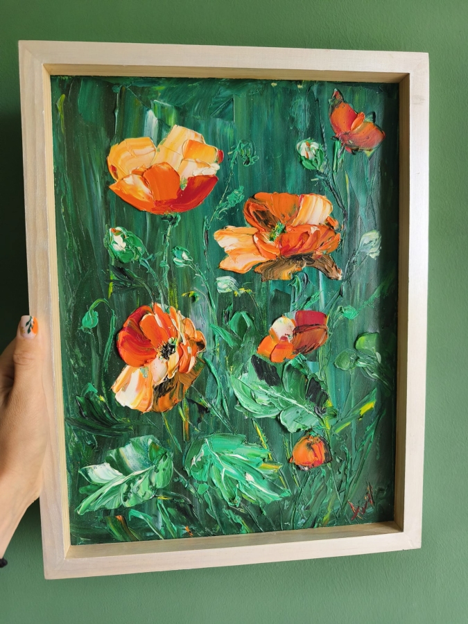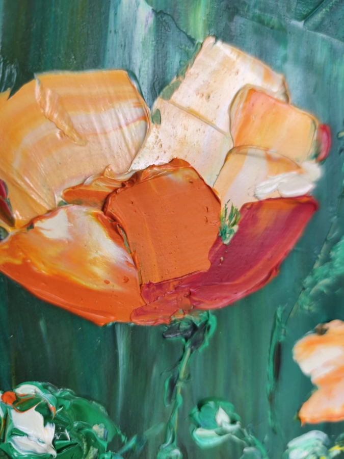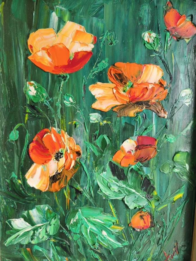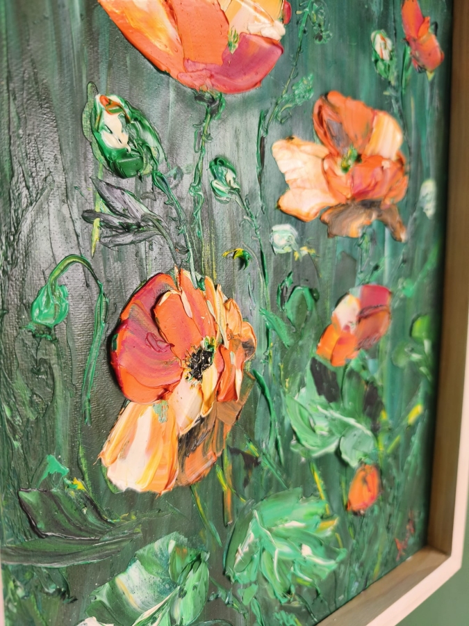 Soczyste pomarańczowe Maki na zielonym tle, namalowane w stylu impasto za pomocą farb olejnych, płótna i szpachli - to kolorowy akcent do Waszego domu, lokalu.