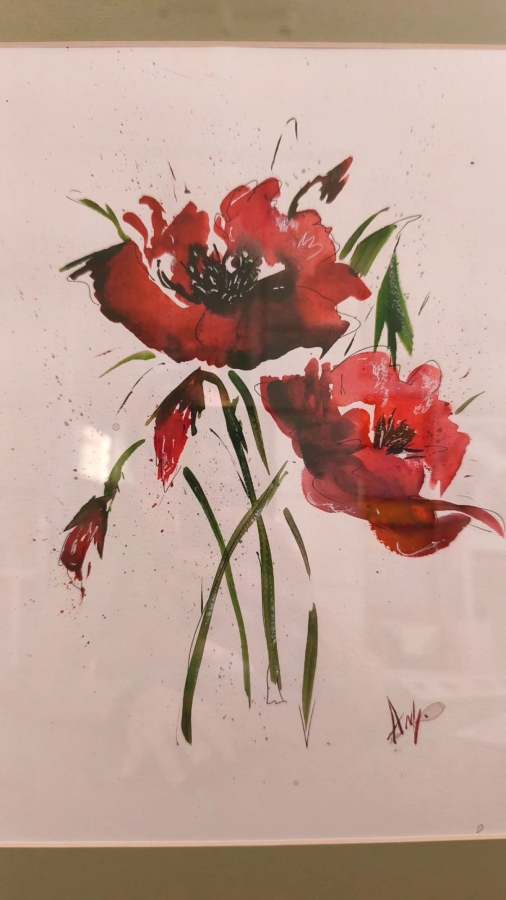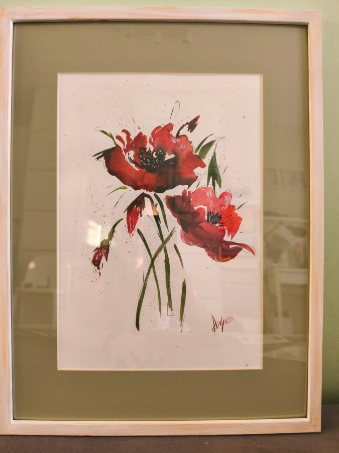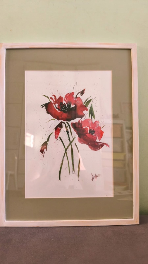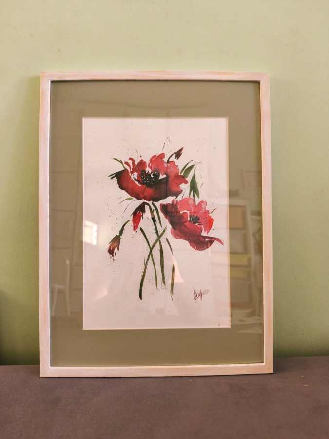 Akwarela rozmiarem A4, w ramce z passe-partoutu w oliwkowym kolorze, rozmiarem 30x40 cm.