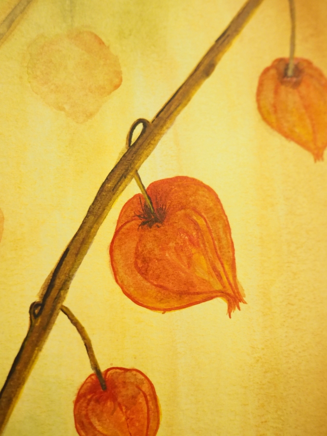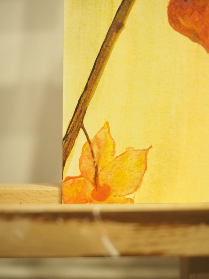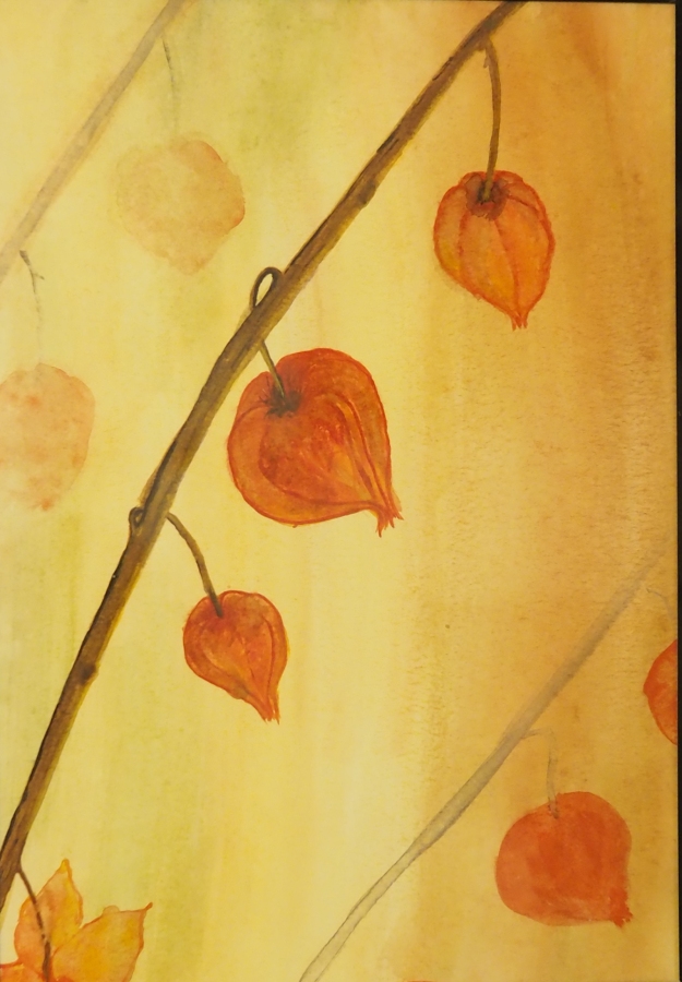 Akwarela formatu A4, w motywie jesiennym w czarnej cienkiej ramce do powieszenia lub postawienia. Jest podyktowana niecodzienną formą samej rośliny i wniesieniem ciepła w ponure dni. Sprawdzi się jako zwyczajna ozdoba pokoju czy salonu.