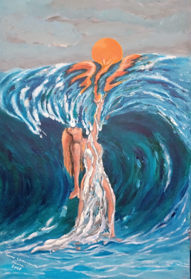 Dziewczyna bawi się w spienionym morzu, chwyta fale, jest rozluźniona i spokojna. Słońce spływa na nią wraz z falami, otrzymuje całe bogactwo istnienia. Obraz ma zamalowane boki i zamontowaną zawieszkę.