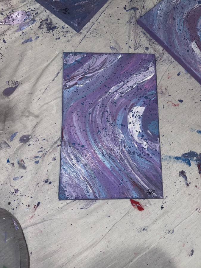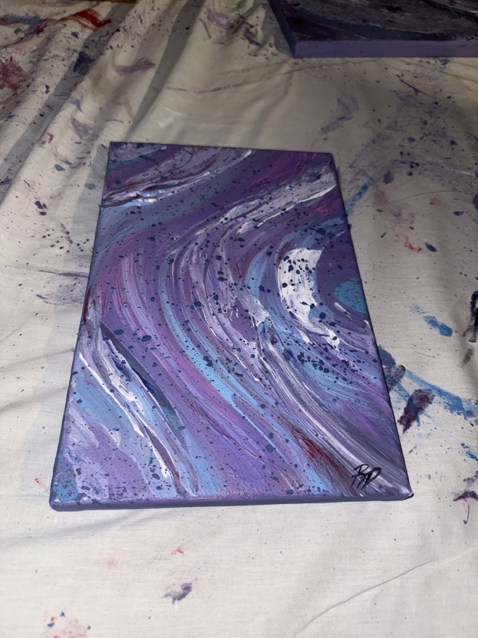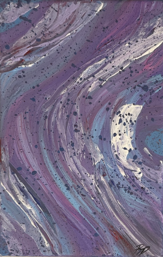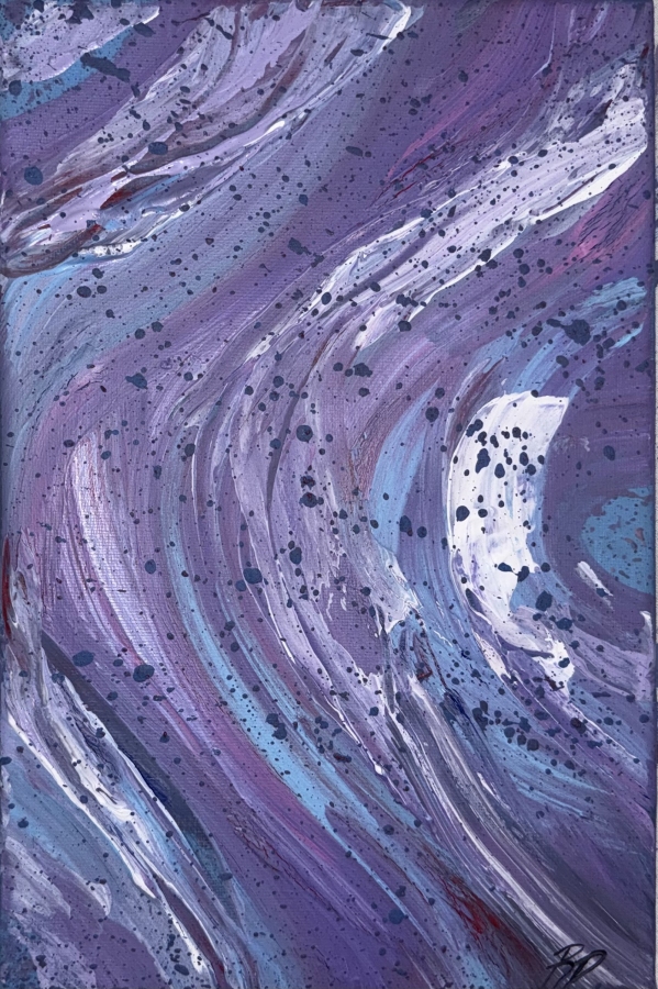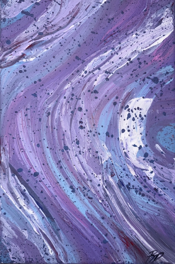 Falujące linie nadają temu dziełu płynność przypominającą zimowy podmuch, który smuga się przez krajobraz. Kolorystyka oparta na chłodnych fioletach i błękitach tworzy wrażenie ruchu lodowatego powietrza. Rozbryzgi farby dodają organiczności i lekkości, jakby drobne kryształki lodu zostały uchwycone w biegu. To kompozycja spokojna, ale pełna subtelnej energii — idealna do miejsc, które potrzebują odrobiny mroźnej elegancji.