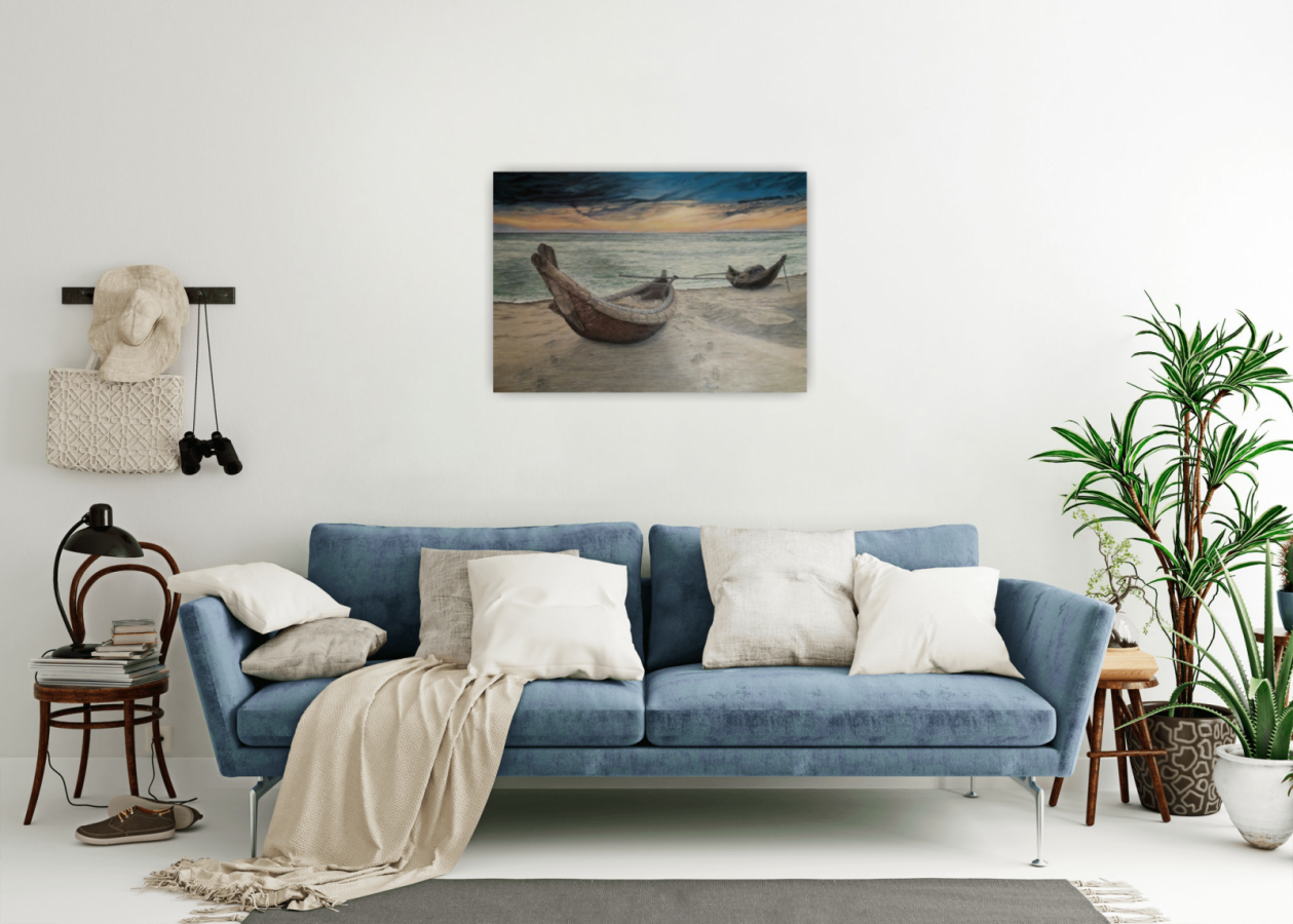 Obraz namalowany jest farbami akrylowymi, boki obrazu są zamalowane , zabezpieczony werniksem, bez ramy. Z tyłu obrazu jest podpis wraz z datą utworzenia dzieła. Obraz jest gotowy do powieszenie ,posiada zamontowaną zawieszkę.